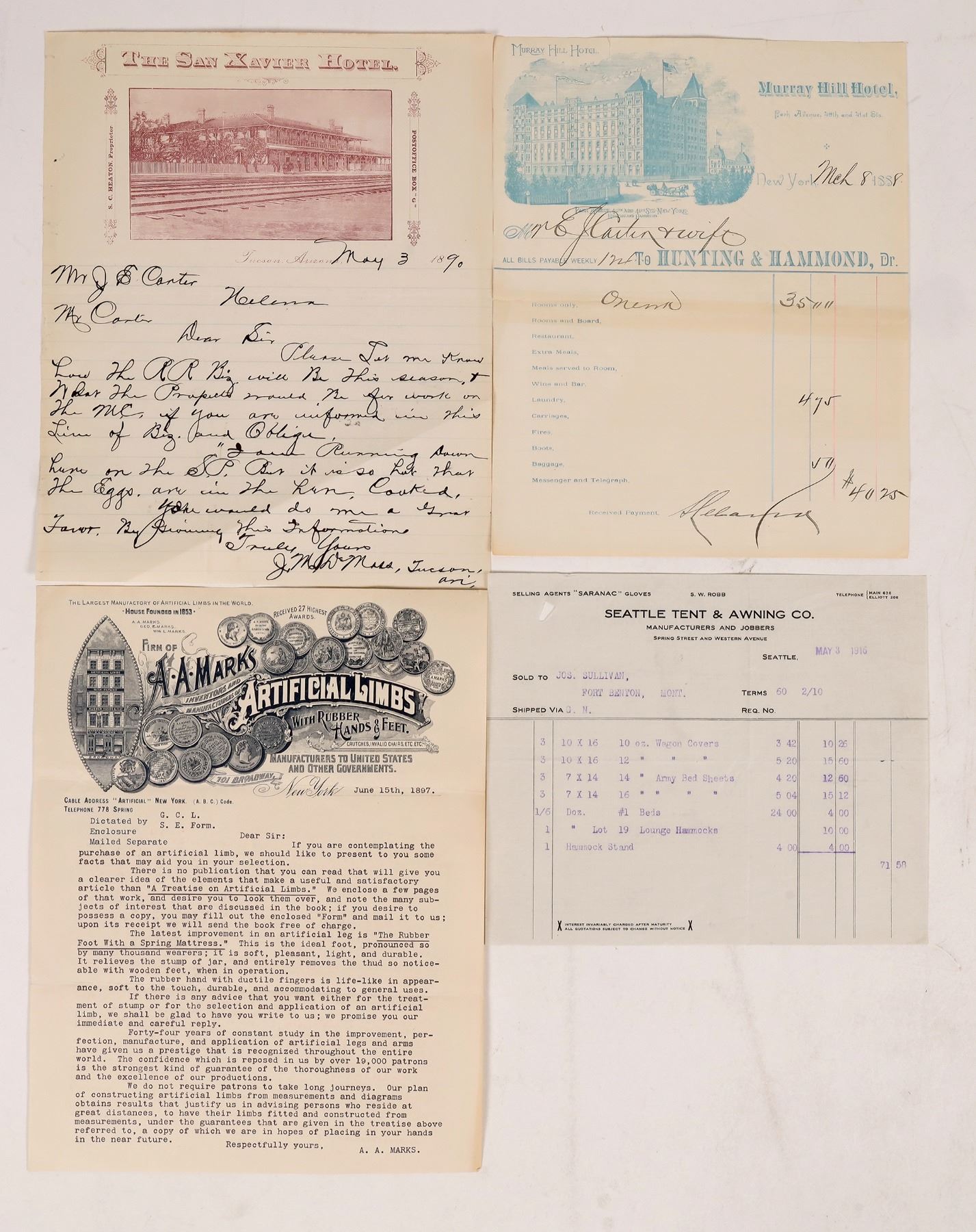 Three pictorial letterheads: 1) The San Xavier Hotel, Tucson, Arizona, letter dated May 3, 1890 to Mr. Carter in Helena concerning the railroad business. (the hotel burned down in 1903) 2) Murray Hill Hotel, Park Avenue, 40th and 41st Streets, New York, dated 1888, Mr. Carter's bill. 3) Firm of A. A. Marks, Inventors and Manufacturers of Artificial Limbs with Rubber Hands & Feet, 701 Broadway, typewritten letter dated 1897.