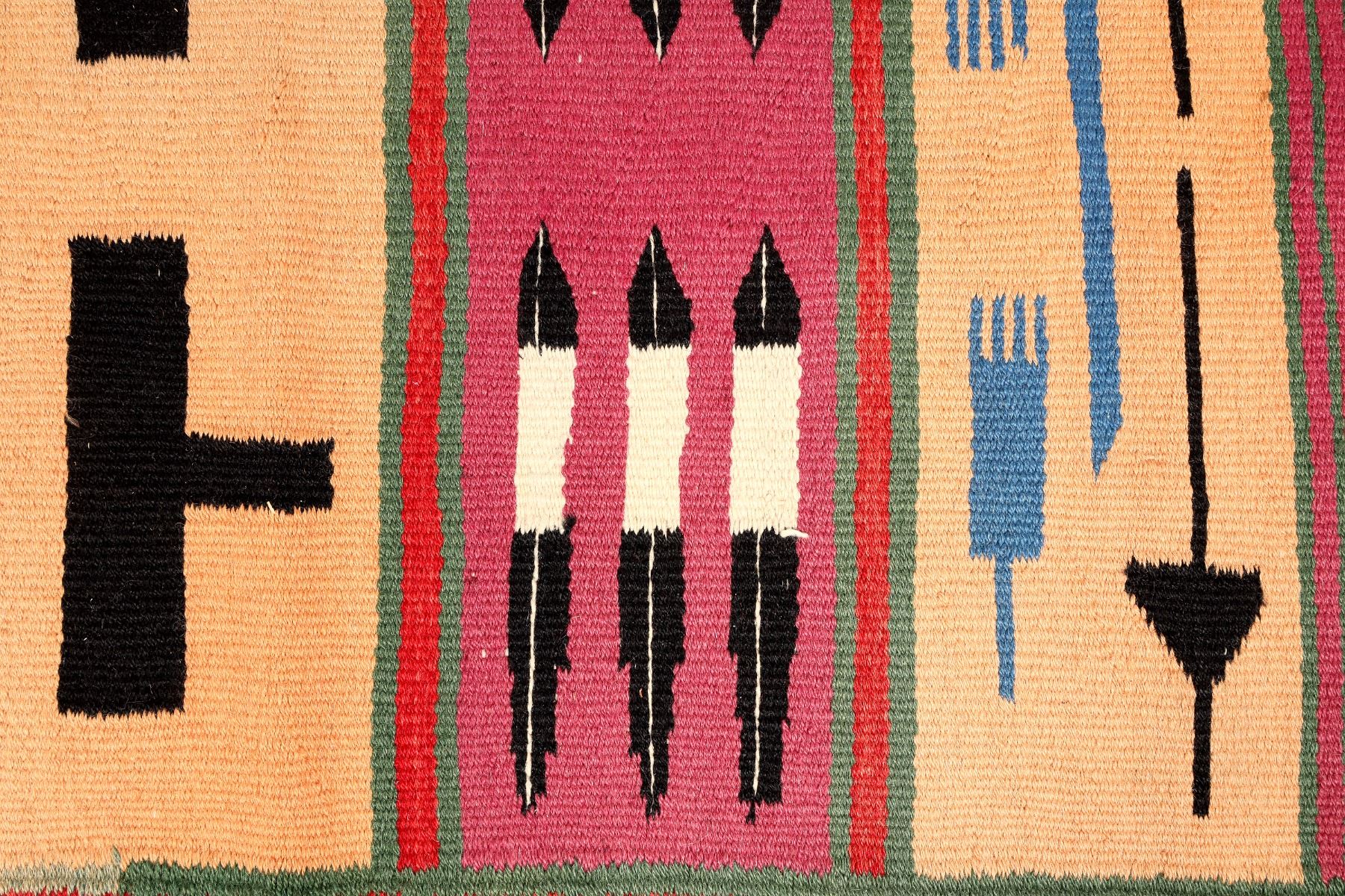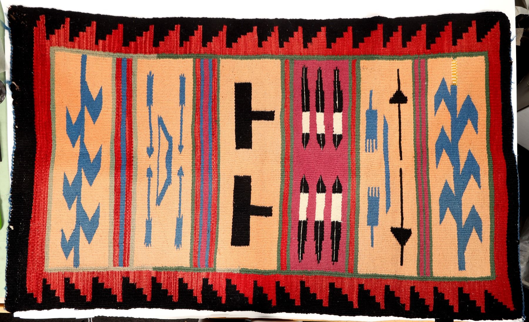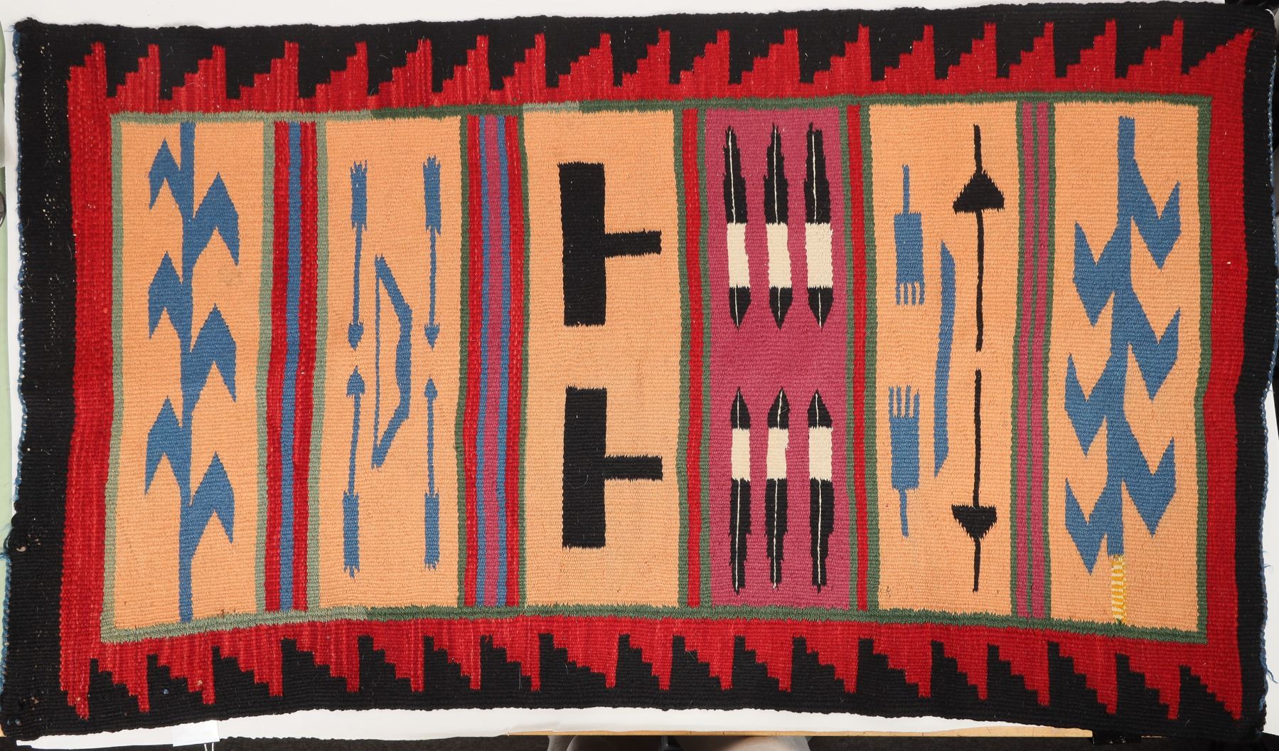 Beautiful choice pictorial rug! Measures 54" x 31" bright colors, blue border on short ends. Spectacular patterns. Excellent condition. Some of the greens vary in color typical of hand dyed wool.