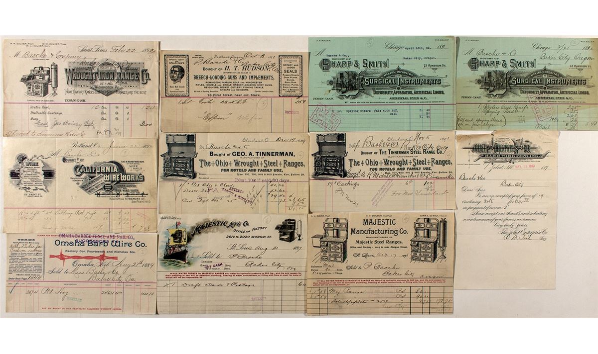 Lot of 11. 1) Portland, Oregon billhead for H.T. Hudson, Breech-loading Guns and Implements. Special Agent for Spalding's Base Ball Goods and Gymnasium Supplies. Vignette of catcher wearing mask. 1891. 2) St. Louis, Missouri billhead for Majestic Mfg. Co. (stoves). Color vignette of ship liner with inset vignette of stove. 1897. 3) Two billheads for The Tinnerman Steel Range Co., Cleveland, Ohio, 1889 and 1891. Same vignette of Ohio Wrought Iron Steel Range. 4) Two Sharp & Smith, Surgical Instruments, Artificial Limbs and Eyes, Chicago, 1892. Vignette of foundry. 5) Majestic Manufacturing Co., St. Louis, 1896 with two range vignettes. 6) Wrought Iron Range Co., St. Louis, 1892 with range vignette. 7) Three wire company bilheads: California Wire Works (Portland, 1892), Omaha Barb Wire Co. (Omaha, 1889), and Joliet Enterprise Co. (Joliet, 1890). (Prag Collection)