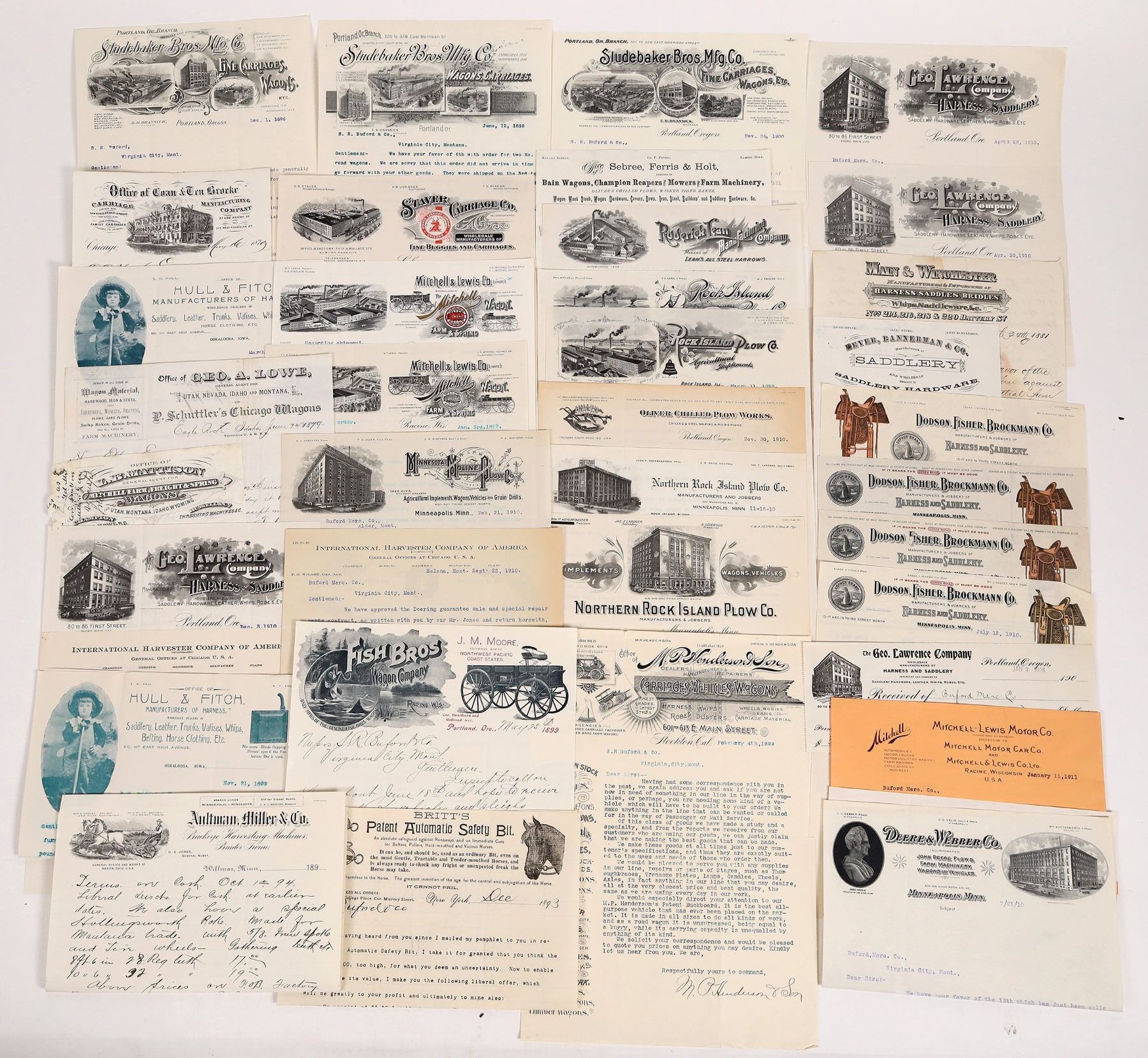 About 25 pictorial wagon letterheads and billheads c. 1887-1912. Studebaker Bros, Staver Carriage, Dodson, Fisher, Brockmann, Roderick Lean, Mitchell & Lewis.