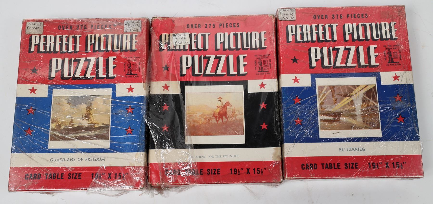 3 different Picture Perfect Puzzles in original boxes. Guardians of Freedom, Blitzkrieg, Heading For The Roundup. Over 375 pieces, 19.5x15.5" when completed.