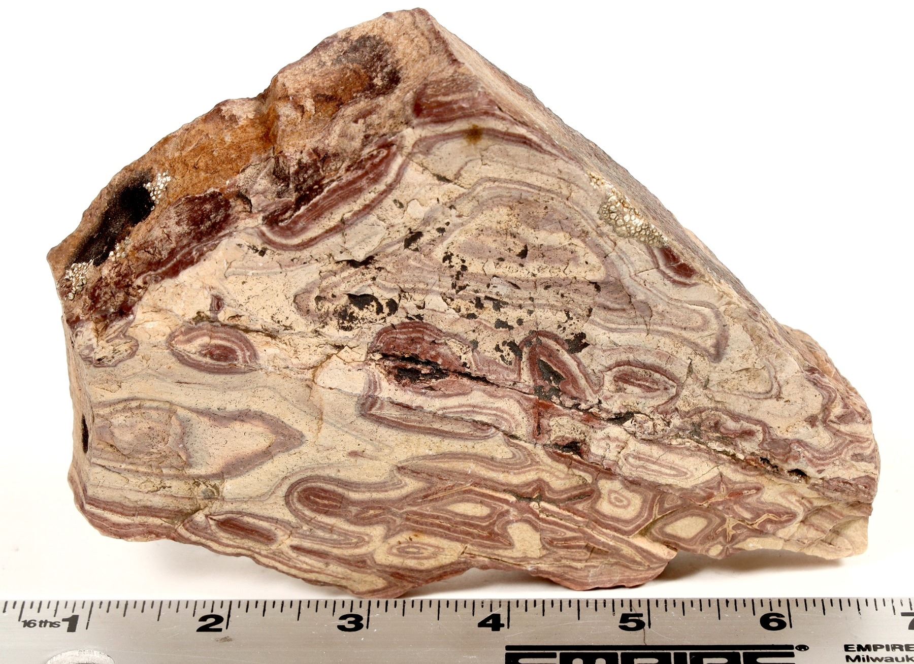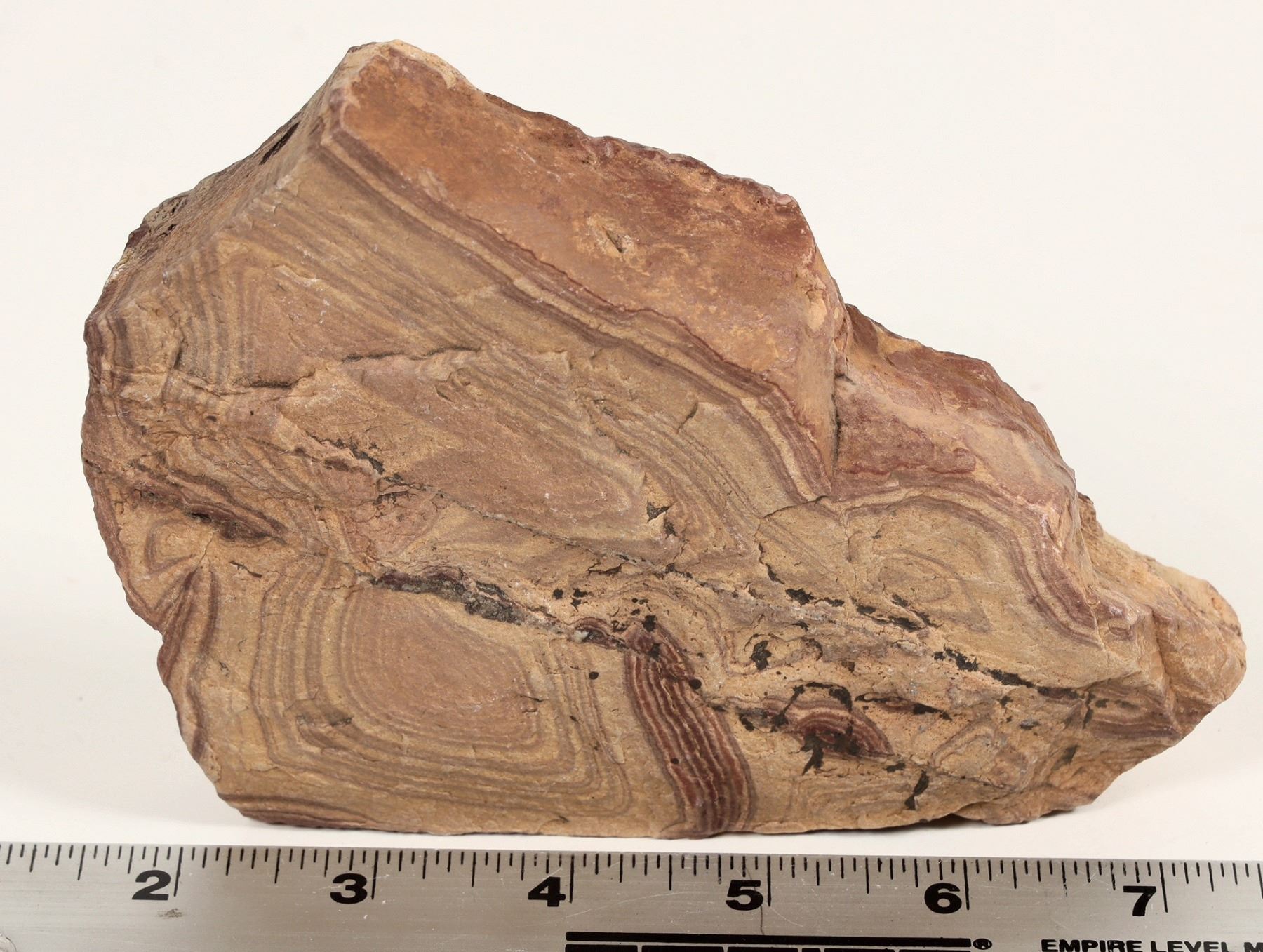 Six inch x 4 x 1.5" specimen of banded iron-oxidation along fracture surfaces, commonly called picture rock. Dave Shaddrick picked this up while working as manager at the Gold Bar Mine, now a major open pit mine.