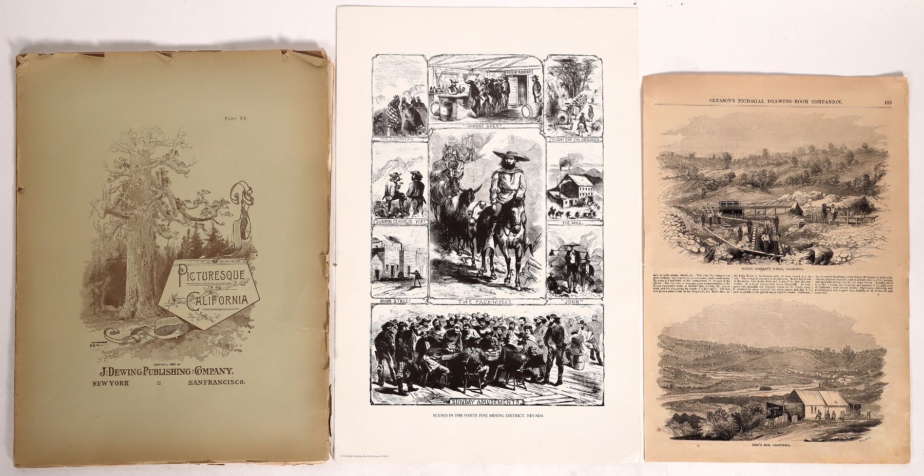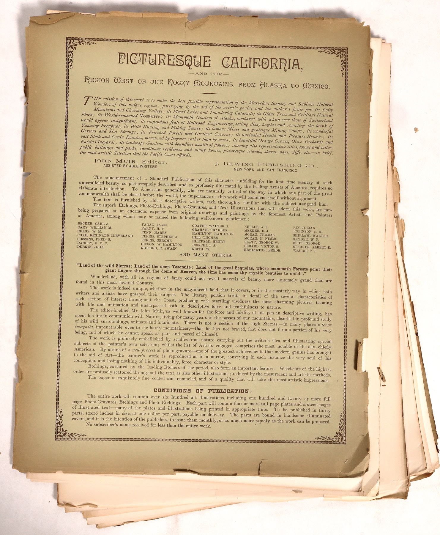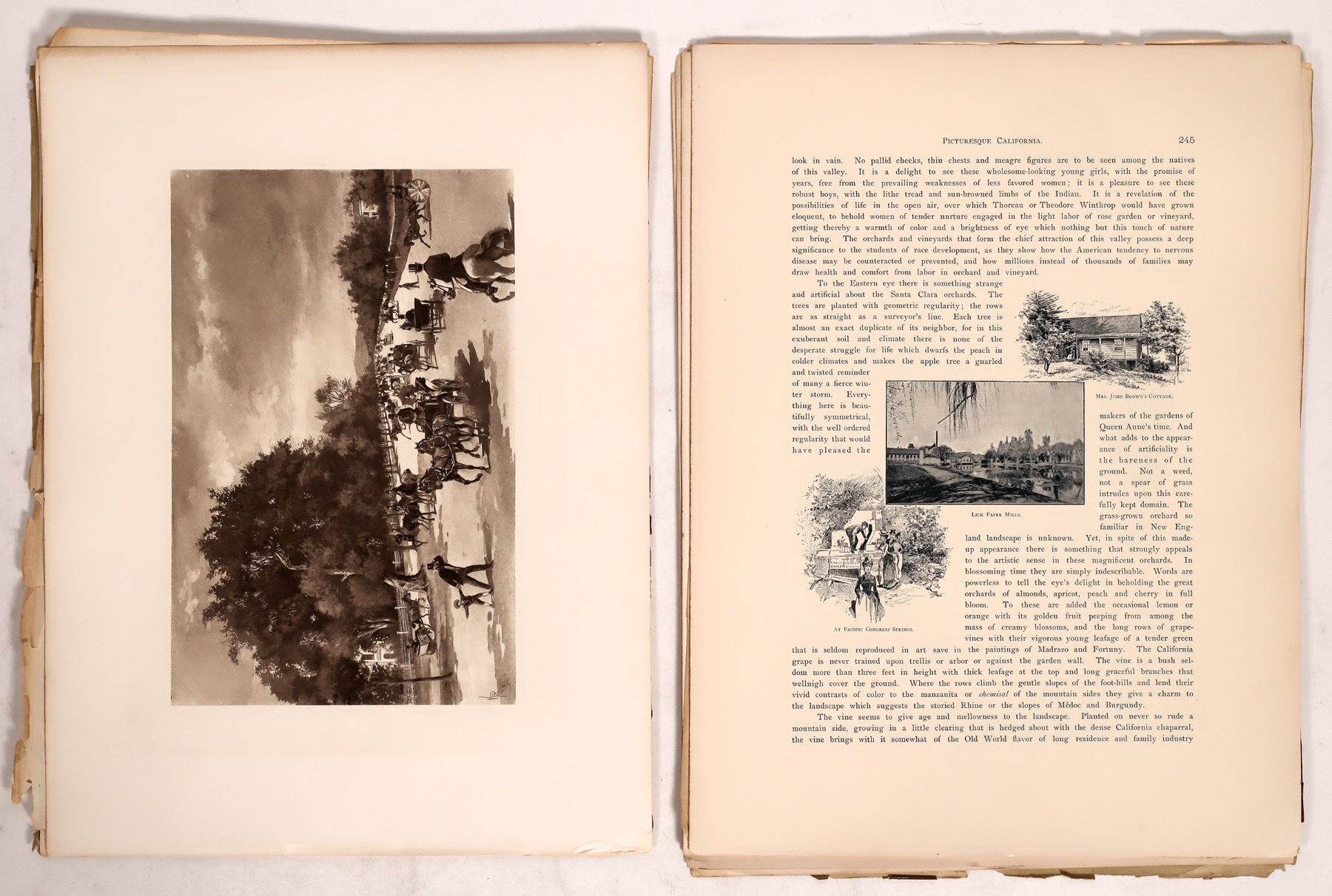 Published by J. Dewing Publishing in 1888; this copy is partial: cover is detached and only 20 pages remain. Pages are 12 x 16 inches and illustrations include Santa Clara Valley and Santa Cruz Mountains, Hotel Vendome, San Jose; Redwoods on Boulder Creek. Several pages of prose around the illustrations. California Franklin Collection