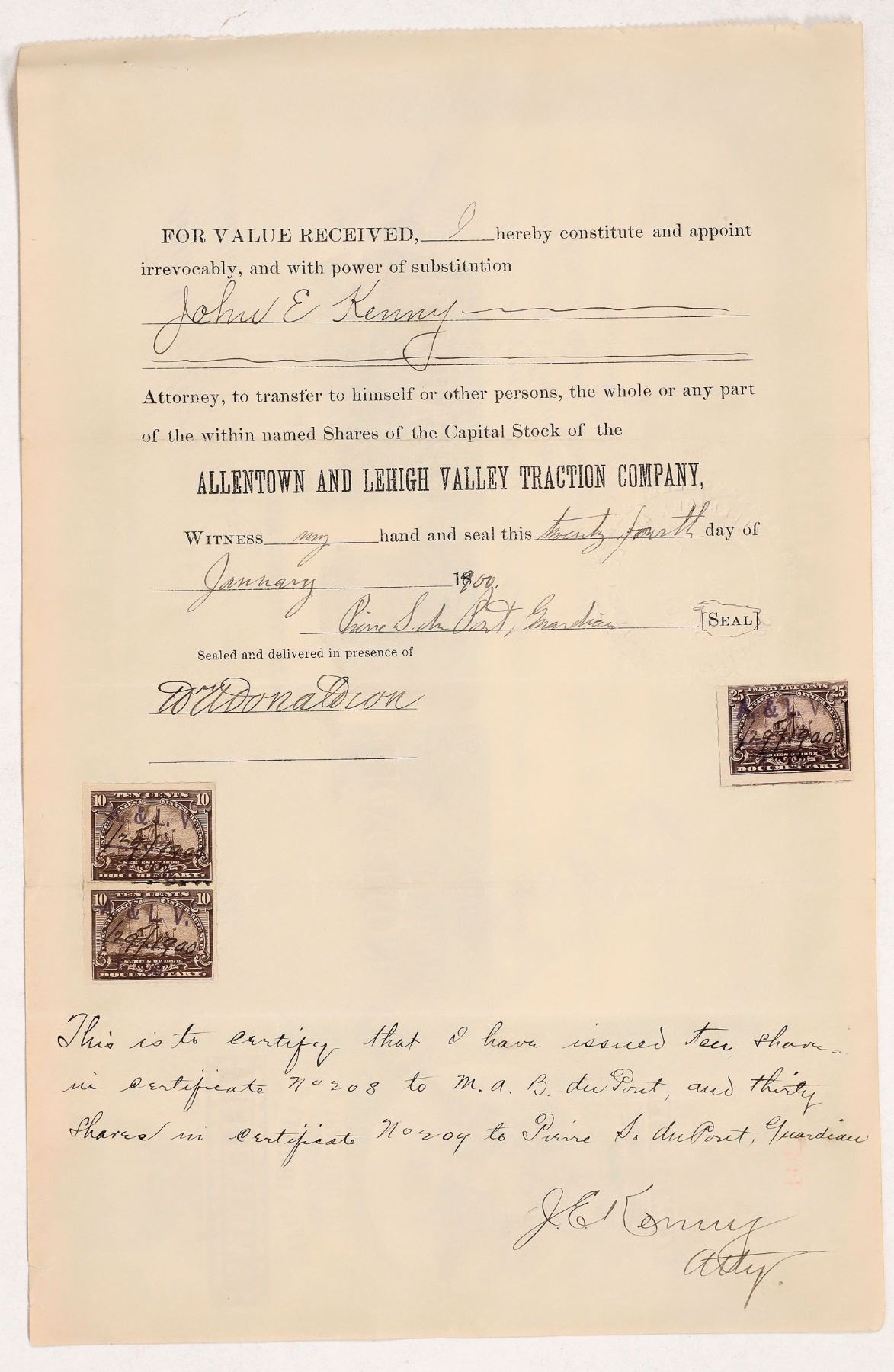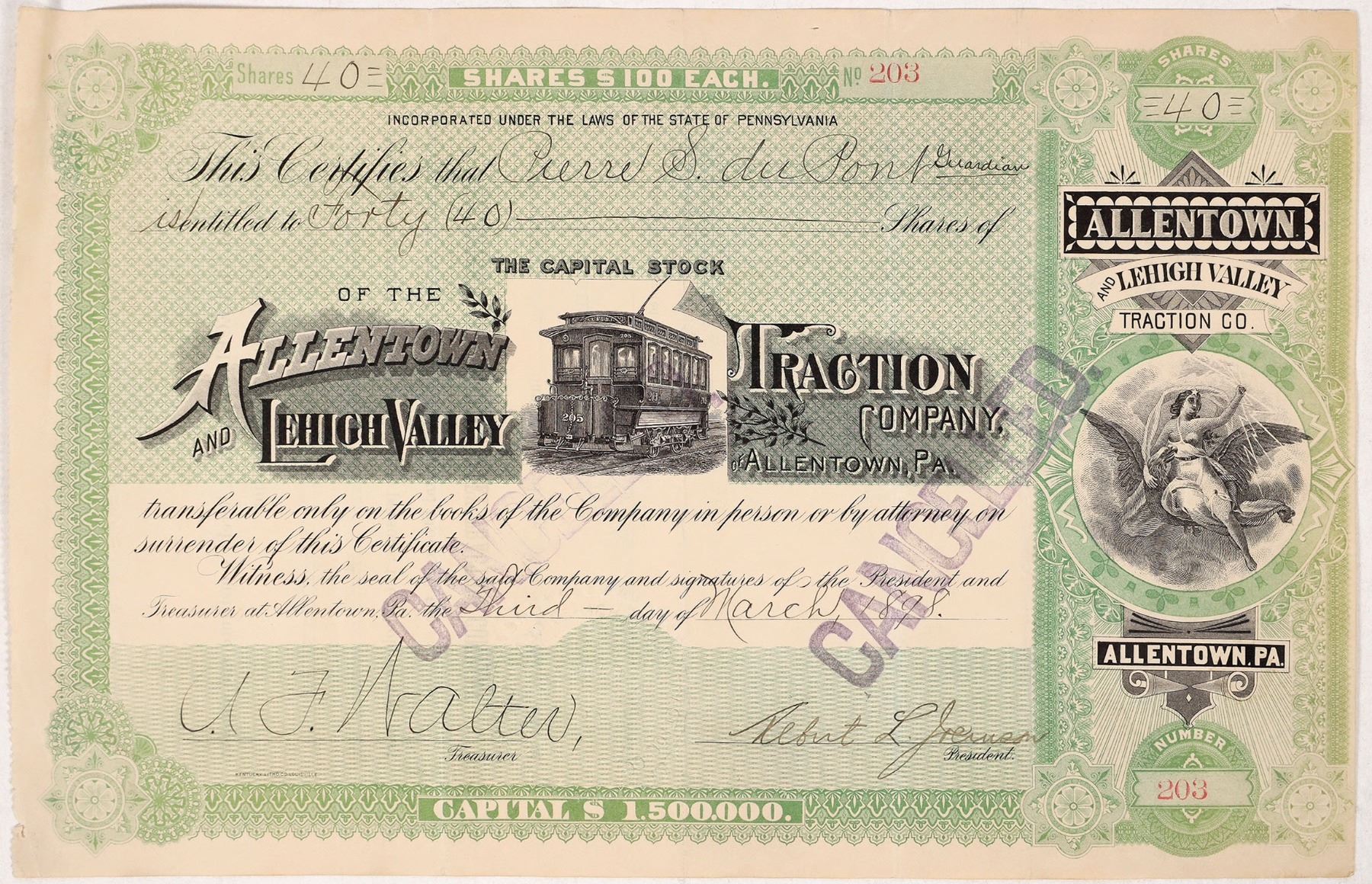 This stock certificate for 40 shares at $100 per, was issued to Pierre S. du Pont by the Allentown and Lehigh Valley Traction Company. It was issued on March 3, 1898. Pierre S. du Pont was an American industrialist, executive, and philanthropist who played a key role in expanding DuPont into one of the world’s largest chemical companies. He also became president of General Motors, where he helped modernize corporate management and finance. A passionate horticulturist, he developed Longwood Gardens into one of the most renowned botanical gardens in the United States.
