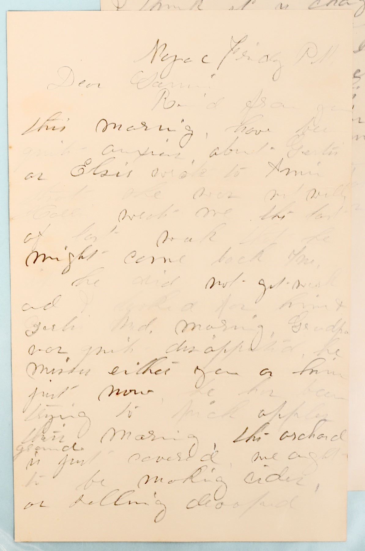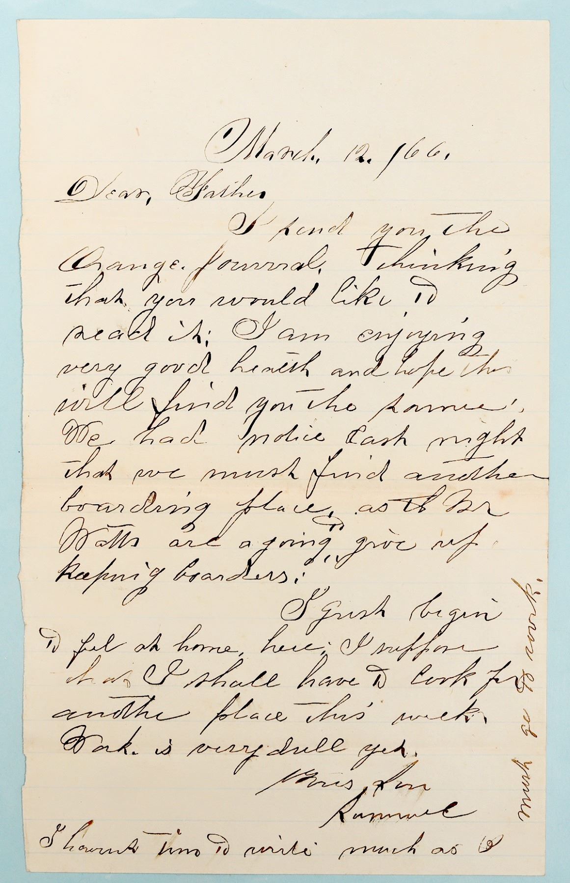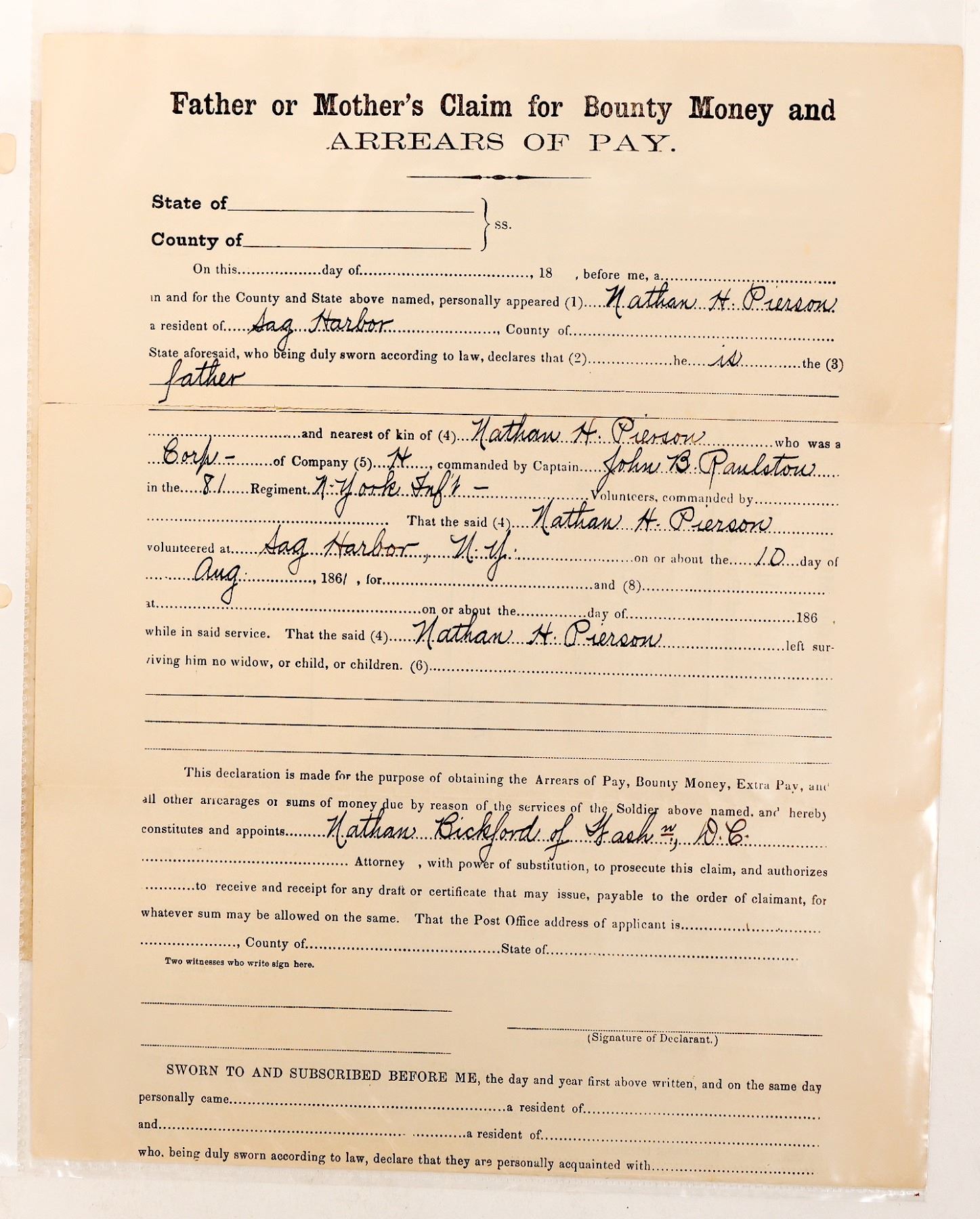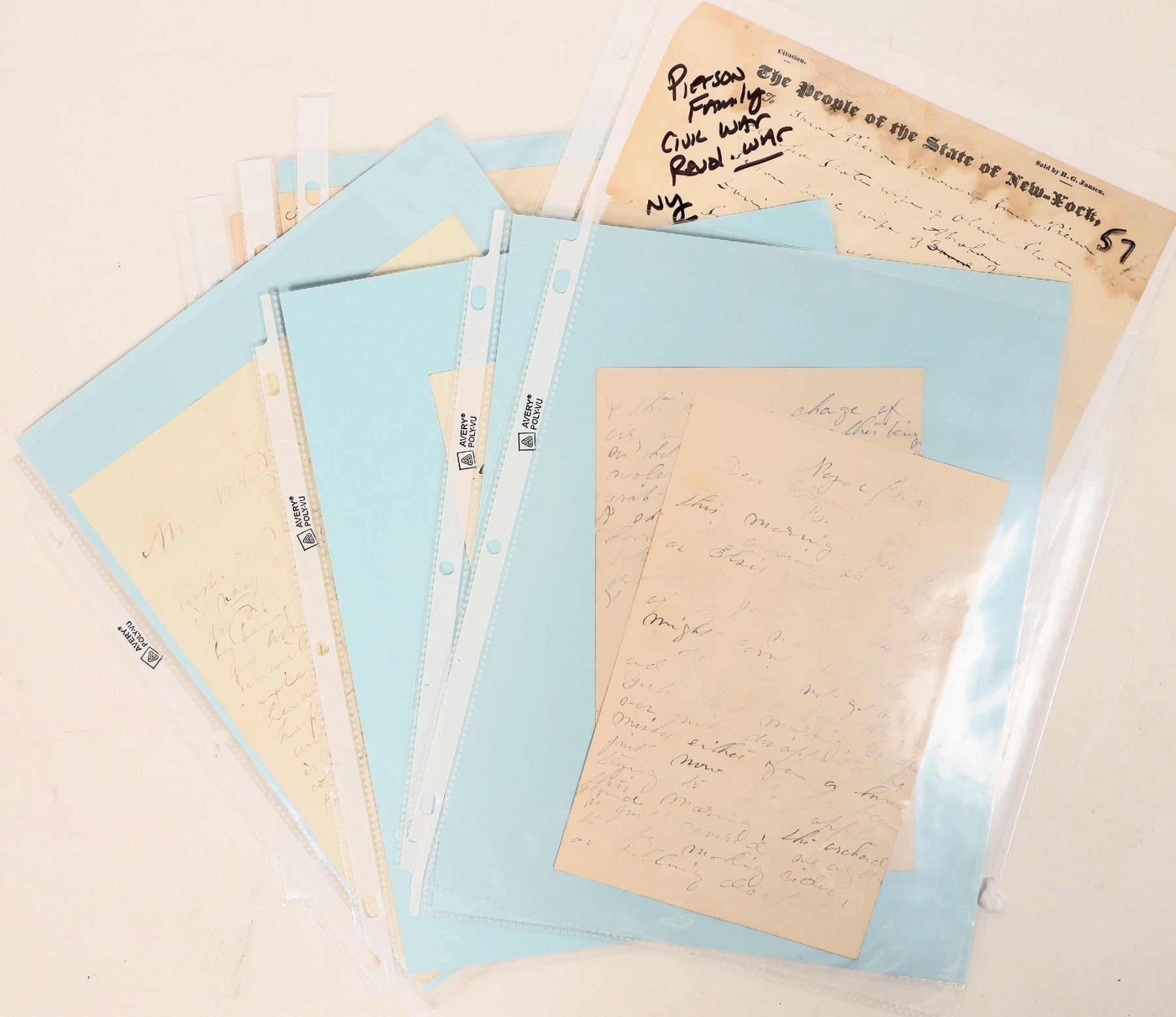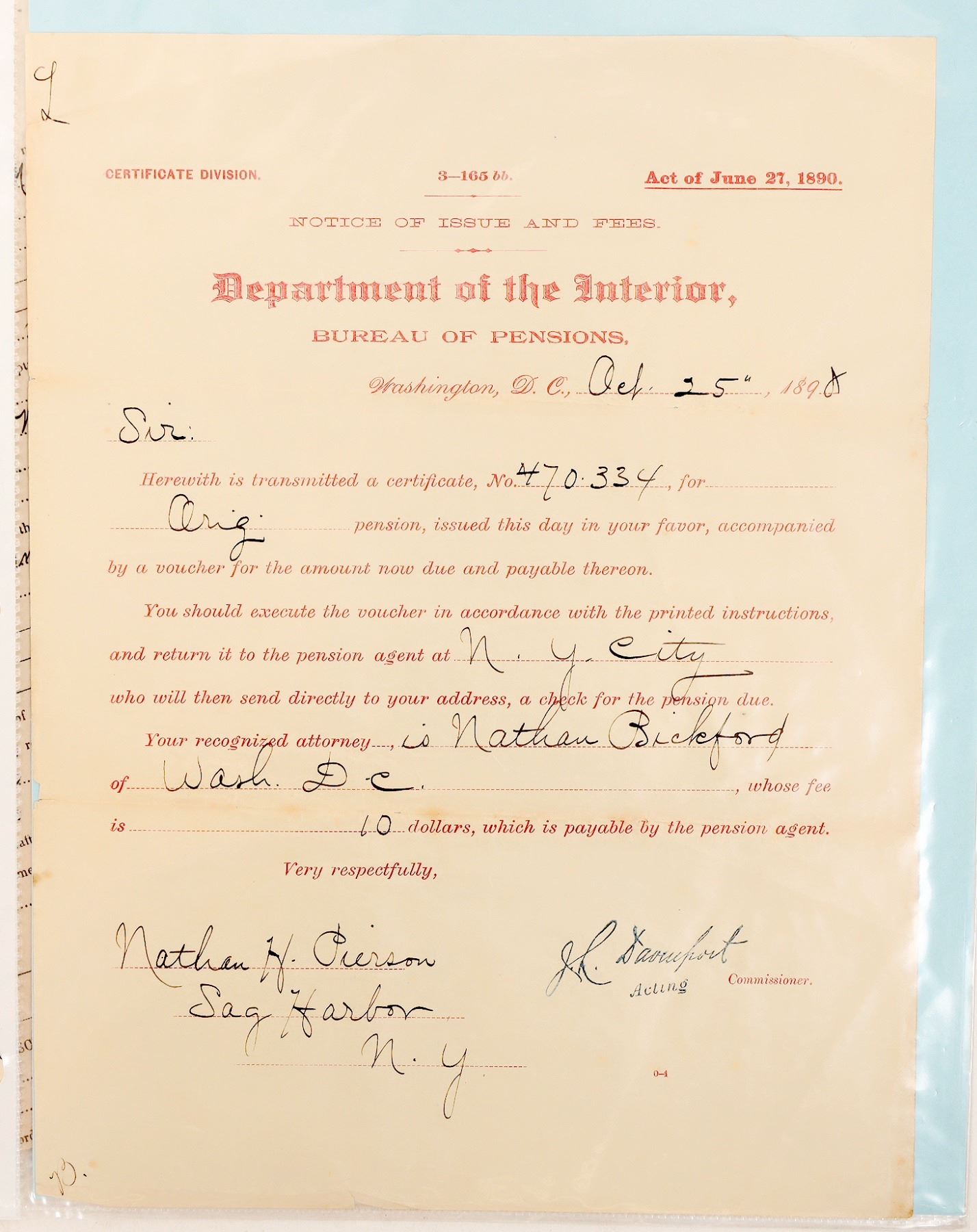 A collection of documents from the Pierson family dating from 1840 to 1898. The documents originate from various locations around New York, Vermont, Massachusetts, and Washington D.C. Included in the collection are a number of handwritten letters between family members, documents from the Department of the Interior approving war pensions, and a claim for bounty money. [ New York