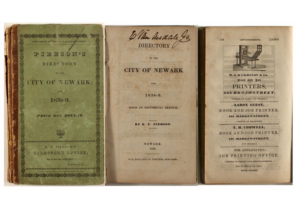 “with an Historical Sketch.” By B. T. Pierson. G. P. Scott & Co., Printers. List of doctors, dentists, and nurses. Index at back. Includes a sketch of the Young Ladies Seminary at Bethlehem. Founded in 1742 by Moravians, descendants of followers of John Amos Comenius, the 17th century Moravian bishop, it was the first boarding school for young women in the U.S. The seminary was created by Benigna, Countess von Zinzendorf, the daughter of Count Nikolaus Ludwig Zinzendorf, who was the benefactor of the fledgling Moravian community. (Is this a statement about Newark that the only sketch in the directory is from Pennsylvania?) Binding beginning to crumble. Front and back cover have small areas that have lost their color. Front cover beginning to become unhinged. Some hand-drawn information. Many advertisements have a pictorial to go with them. 160 pages. [Rarity: i]City: NewarkCounty: State: NJDate: