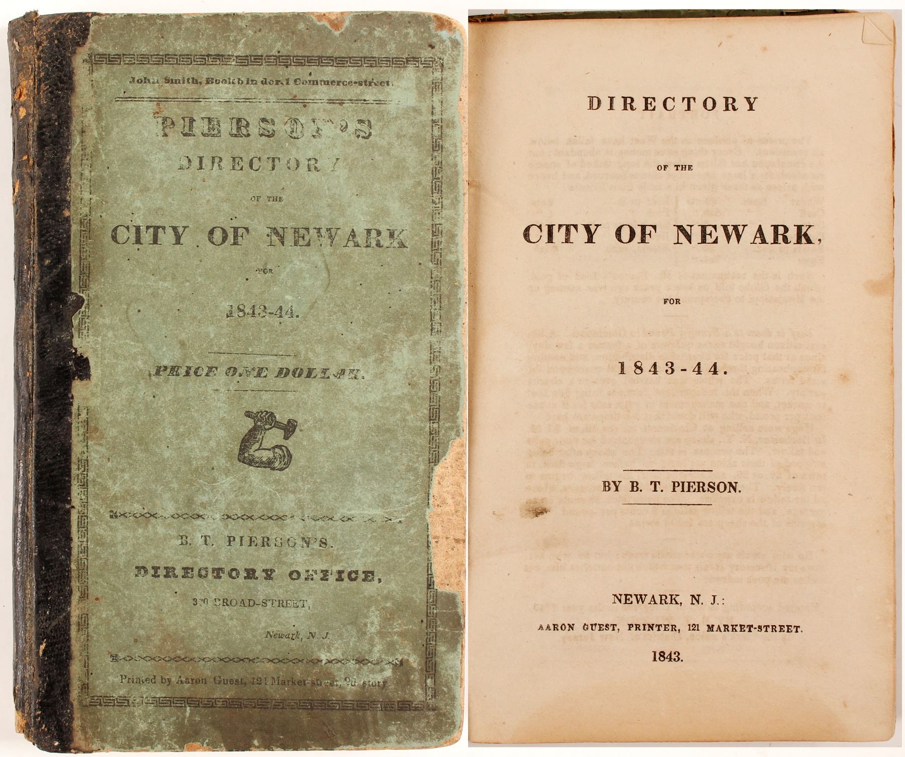 Pierson, B. T., Pierson‘s Newark City Directory for 1843-44. Published by Aaron Guest, 1843. 228 pages in generally fine condition. City: Newark State: New Jersey Date: 1843 HWAC# 82851