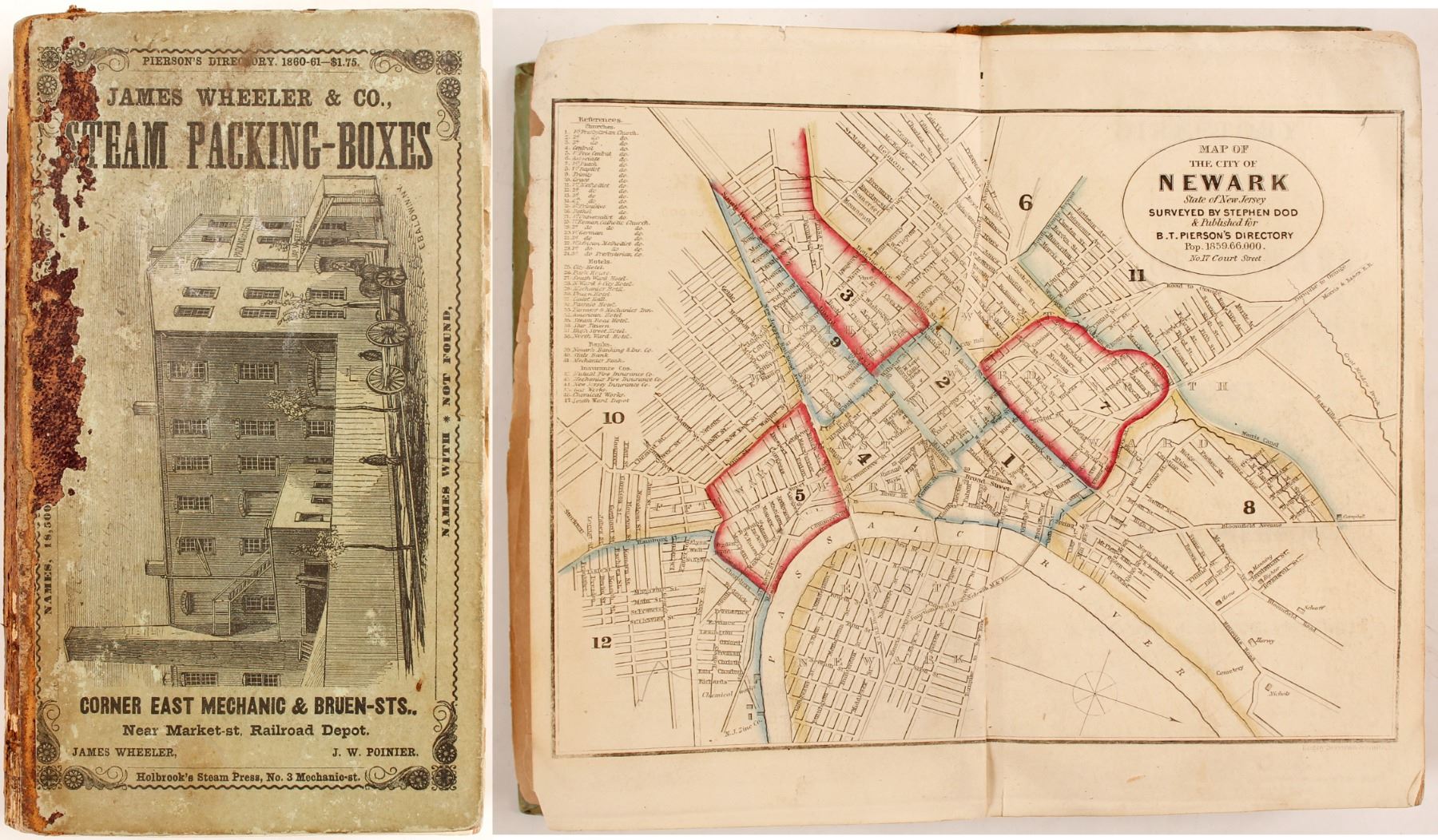 Pierson, B. T., Pierson‘s Newark City Directory for 1860-1, volume 26. Published by A. Stephen Holbrook, 1860. This issue includes a folded, color-shaded map of Newark, NJ. 566 pages plus appendix. Cover boards are loose. City: Newark State: New Jersey Date: 1860 HWAC# 82848