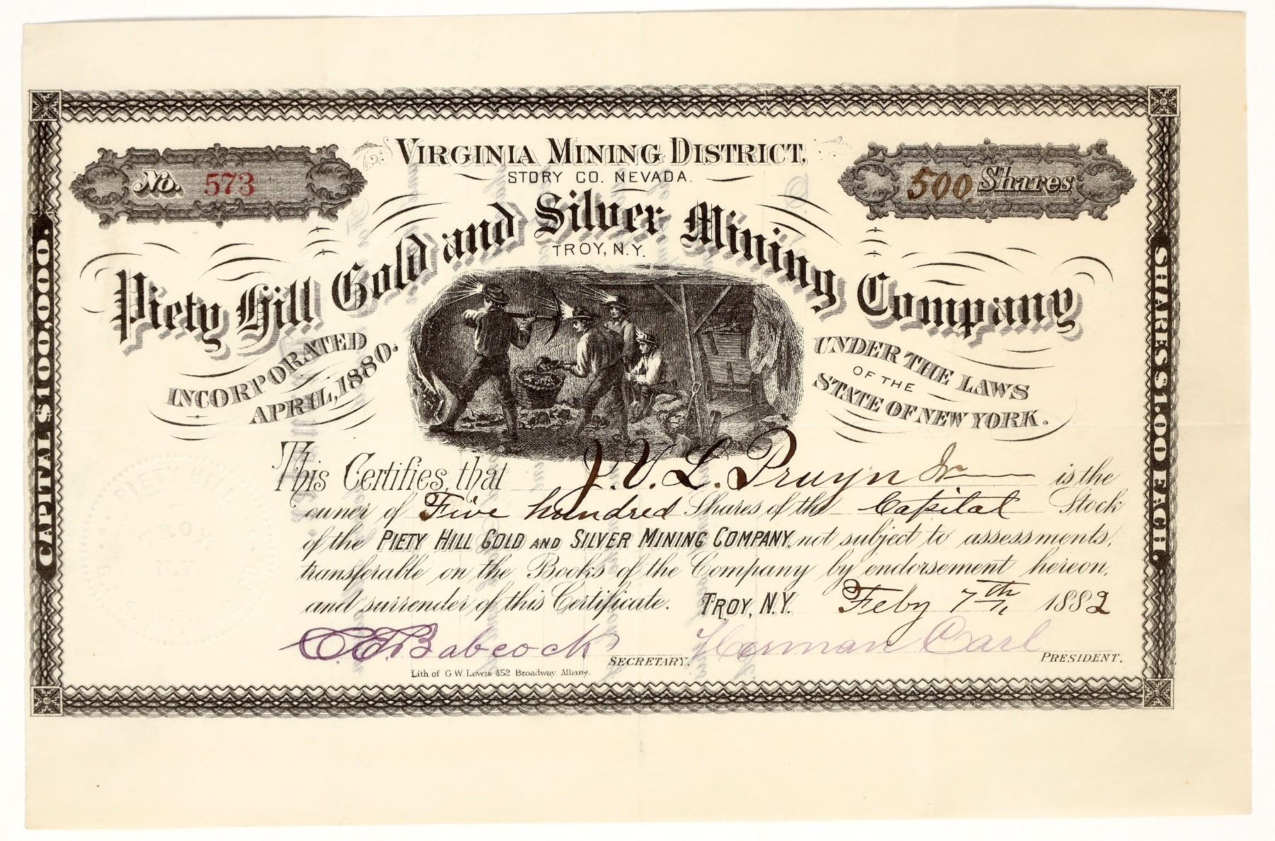 Incorporated April, 1880. Location: Virginia Mining District, Story [sic] Co. Nevada. Certificate # 573, issued for 500 shares to John L. Pruyn on Feb.. 7th, 1882. Signed by Herman Carl (president) and Babcock (secretary). Not cancelled. Vignette in center of miners working underground with headlamps on. Printed by G.W. Lewis, 452 Broadway, Albany. Folds, clean. The company was located in-between Gold Hill and Virginia City. Offices were based in Troy, N.Y.