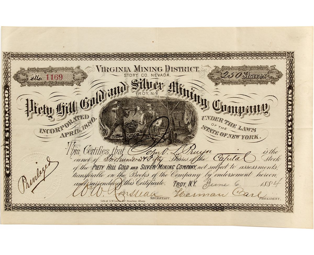 1884. Incorporated April, 1880. Location: Virginia Mining District, Story [sic] Co. Nevada. Certificate # 1169. Issued for two-hundred fifty shares to John L. Pruyn (?) on June 6, 1884. Signed by Herman Carl (president) and W.W. Rousseau (secretary). Vignette in center of miners working underground with headlamps on. Printed by G.W. Lewis, 452 Broadway, Albany. "Privileged" written over seal at left. Pin holes on left, otherwise very clean. The company was located in-between Gold Hill and Virginia City. Offices were based in Troy, N.Y.City: Virginia CityCounty: StoreyState: NVDate: 1884