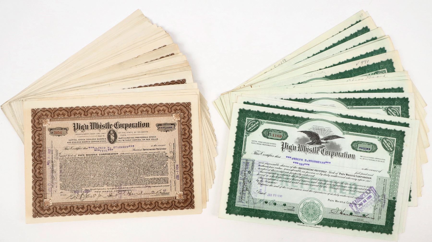 About 60 issued stock certificates from Pig'n Whistle Corporation. About 40 are brown ink with a whistling pig vignette; about 20 are green ink with an eagle vignette.