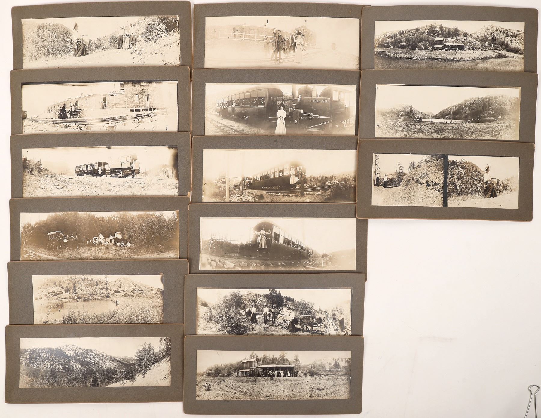 15 nice mostly single shot Pike's Peak panorama vintage photos. Railroad cars, lady with a pistol, wagon, family etc. Photos 3.5x11.5". Pike's Peak Colorado