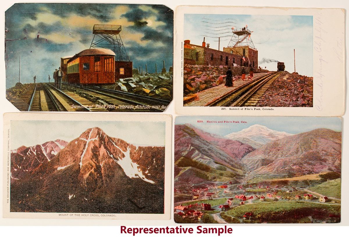 Postmarks pre 1920. 32 postcards include: Pike's Peak Avenue, Summit of Pike's Peak, Mount of the Holy Cross, Manitou and Pike's Peak, Panoramic View, Signal Station, Cog Road, Half-way House, and more. Pike's Peak Collection City: Pike's Peak State: Colorado Date: ID# 44475