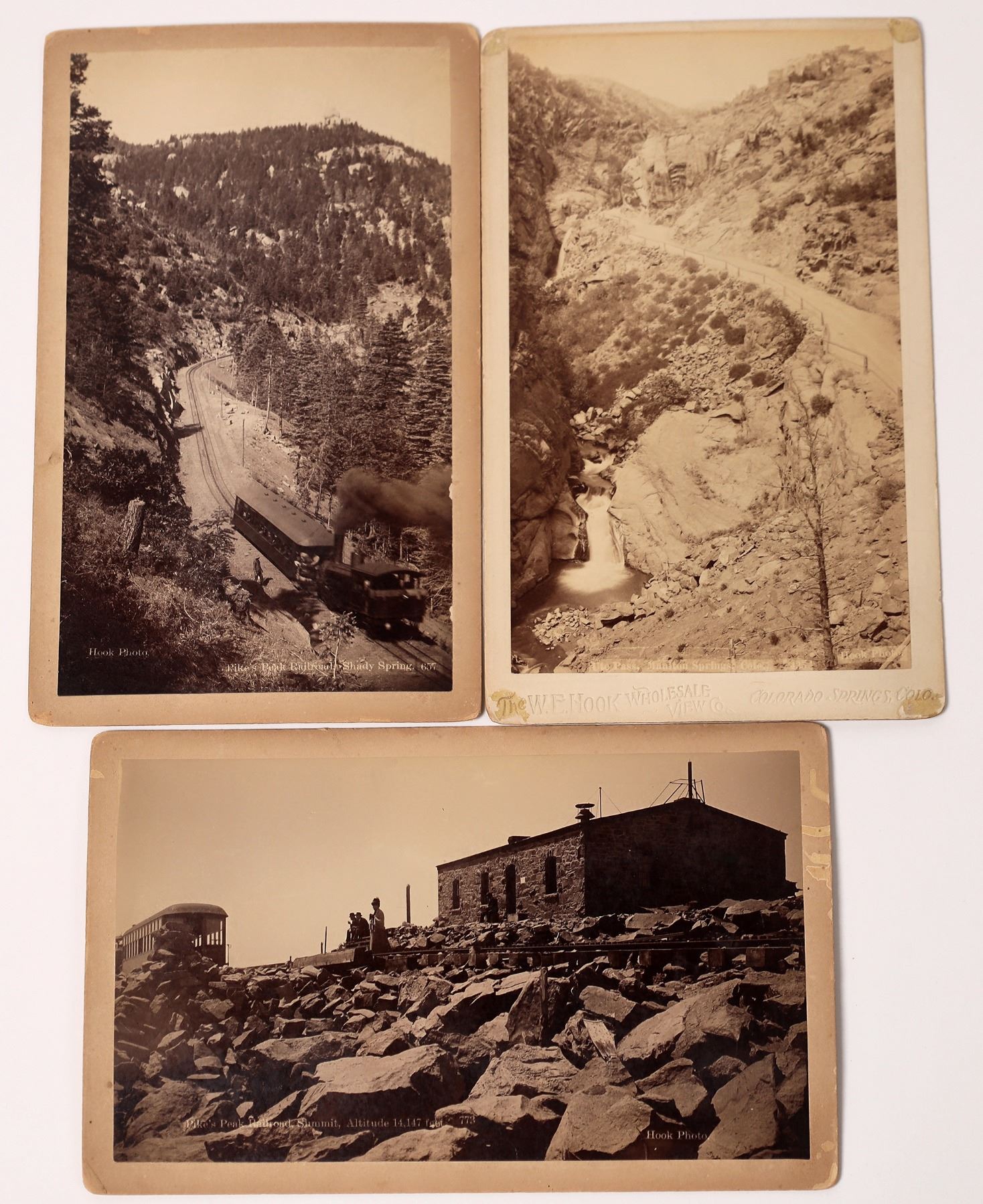 Three photographs of the Pike's Peak Route in Colorado, produced by W.E. Hook Wholesale Views Co., c. 1890s. These three photographs show the Pike's Peak Railroad in Shady Spring, the Pike's Peak Railroad at Summit, and Ute Pass in Manitou Springs. Each photograph is approx. 8 x 5 inches. Good condition.