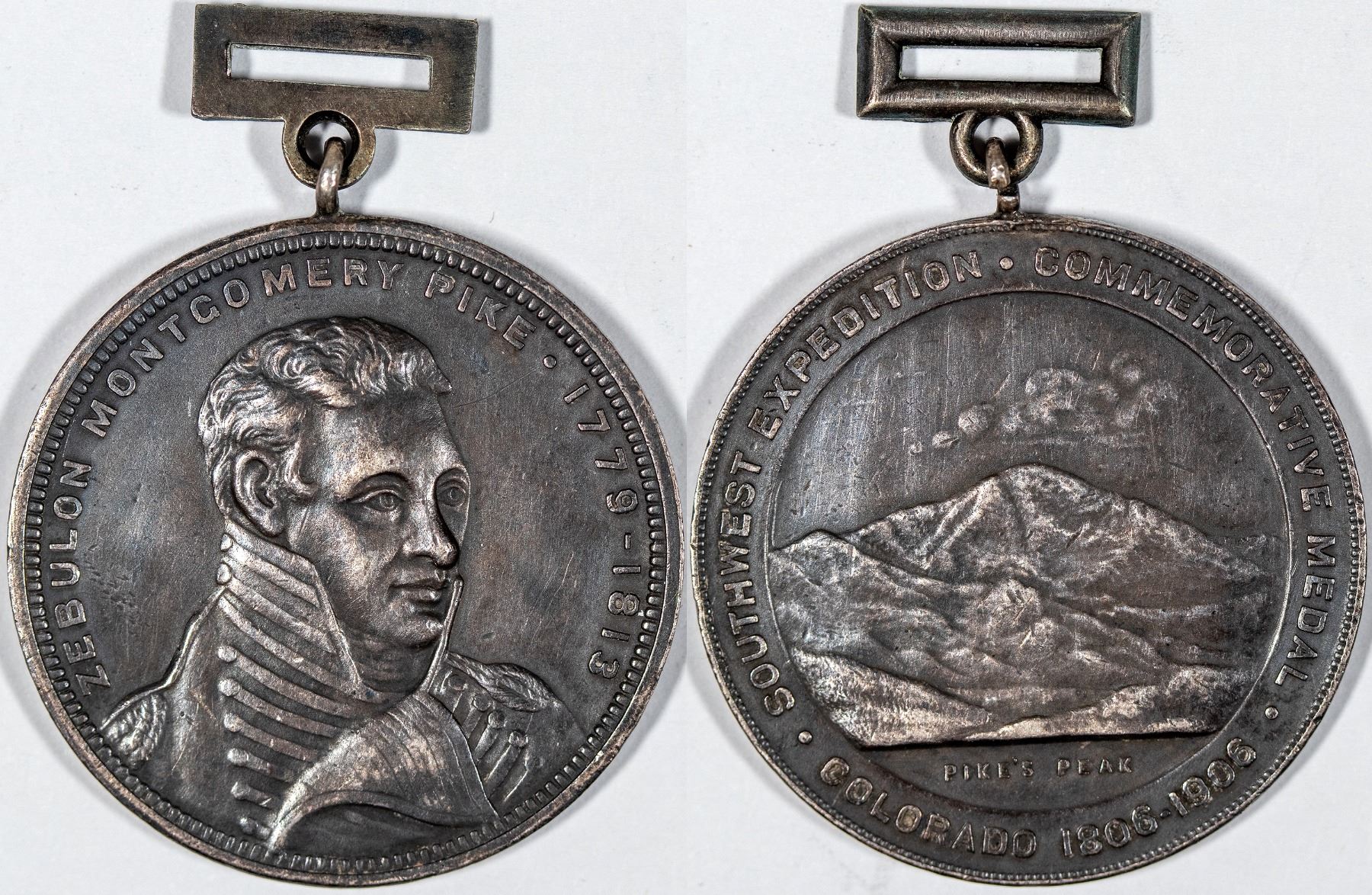 Mounted in a bezel with loop for hanging, HK-336. Obv: Male bust, part r.; around Zebulon Montgomery Pike. 1779-1813; Rev: Mountain peak, below Pike's Peak--within center circle; outside, around Southwest Expedition • Commemorative Medal; below • Colorado 1806-1906 • Silver, gray-oxidized finish. Coin EF-AU condition.