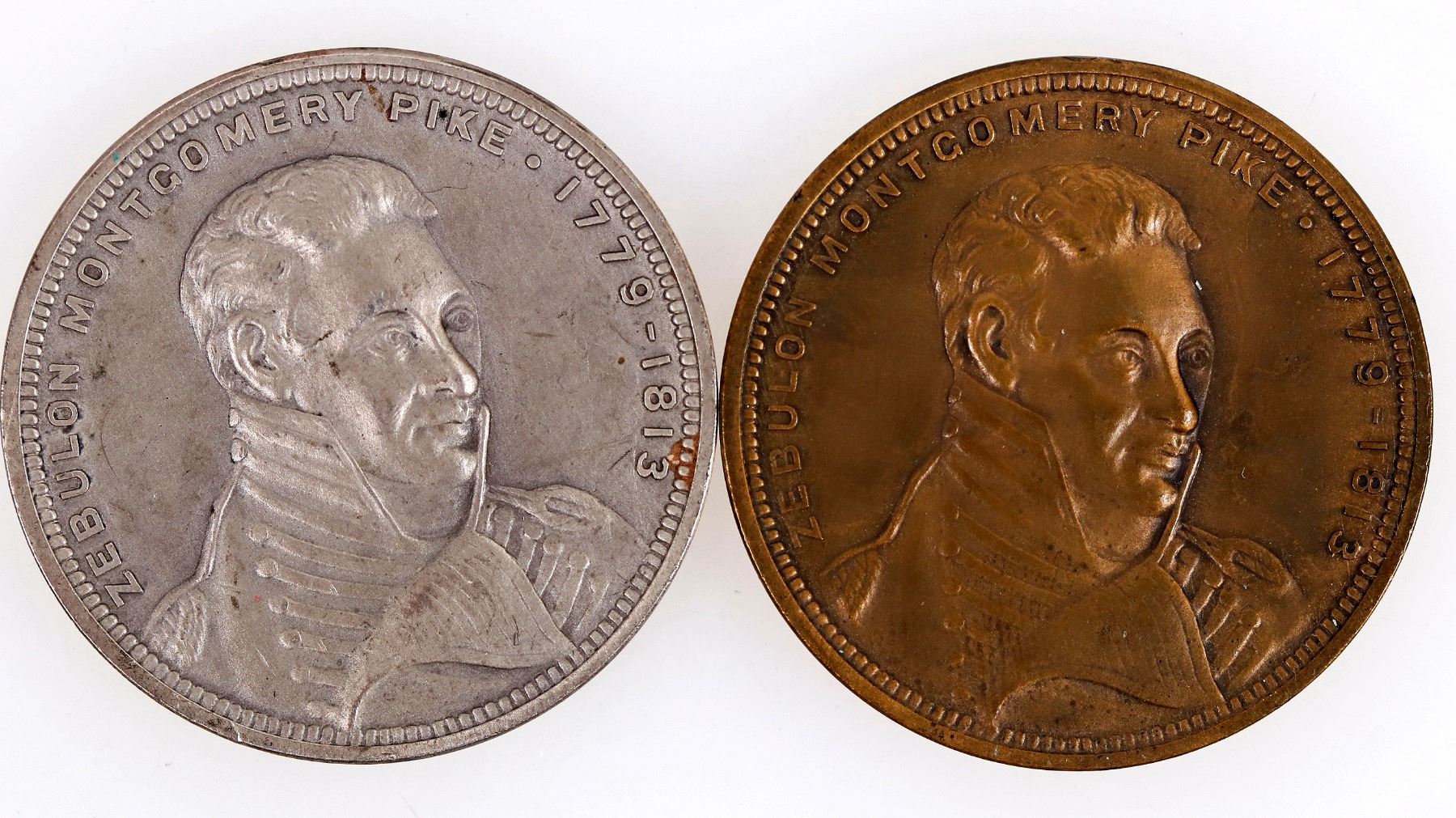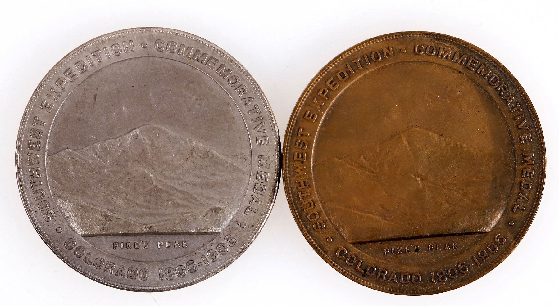 1906 Pike's Peak Centennial Official Medal, bronze, fob removed. Rarity R-3. Both are in very good to excellent condition.
