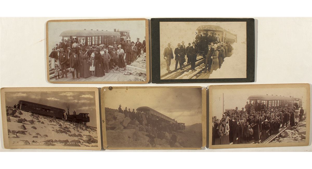 Lot of 5 cabinet cards that show people outside of train cars on the summit of Pikes Peak. The railroad is the Manitou & Pikes Peak Railway. Includes: four from J.G. Hiestand:"Climbing a 25% Grade in Deep Snow. M & P.P. Cog. Road, Hiestand Photo." (best shot in the set, good detail and contrast); "No. 1 on Pikes Peak, Alt. 14147 ft. May 27, 1901" (two people identified with pen (the Hiltons), description of railroad on back, medium contrast, some soiling); "No. 1 on Pikes Peak Alt. 14147 ft., Aug 16, 1899, J.G.H. Photo." (medium contrast, forty or so people); and "No. 2 on Pikes Peak" (undated, medium contrast one scratch). Also, one card from F.E. Post (c.1890), poor contrast, soiling and pin holes. Hiestand's Manitou gallery is not listed in Mautz. A very unique set in good condition. (Prag Collection)