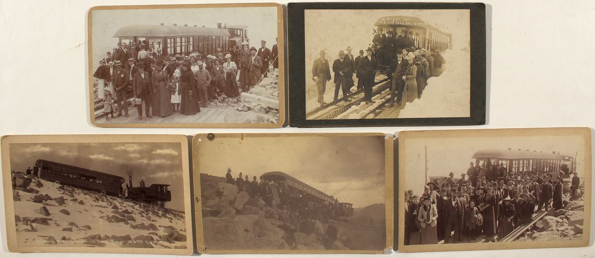 Lot of 5 cabinet cards that show people outside of train cars on the summit of Pikes Peak. The railroad is the Manitou & Pikes Peak Railway. Includes: four from J.G. Hiestand:"Climbing a 25% Grade in Deep Snow. M & P.P. Cog. Road, Hiestand Photo." (best shot in the set, good detail and contrast); "No. 1 on Pikes Peak, Alt. 14147 ft. May 27, 1901" (two people identified with pen (the Hiltons), description of railroad on back, medium contrast, some soiling); "No. 1 on Pikes Peak Alt. 14147 ft., Aug 16, 1899, J.G.H. Photo." (medium contrast, forty or so people); and "No. 2 on Pikes Peak" (undated, medium contrast one scratch). Also, one card from F.E. Post (c.1890), poor contrast, soiling and pin holes. Hiestand's Manitou gallery is not listed in Mautz. A very unique set in good condition. (Prag Collection) City: Pikes Peak State: Colorado Date: 1890-1901 hwac# 27109