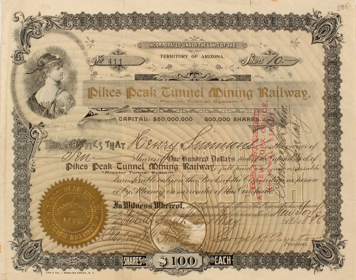 Number 411 for 10 shares in 1896 to Henry Simmons. Signed by George Proctor and ?. Shares $100 each. Gold title and brown and gold background. The company formed to develop a system of railroad tunnels in Cripple Creek, as well as develop mine interests in the area and use the water encountered for power generation and irrigation for Cripple Creek. (Prag Collection) City: Pikes Peak State: Colorado Date: 1896 hwac# 23747