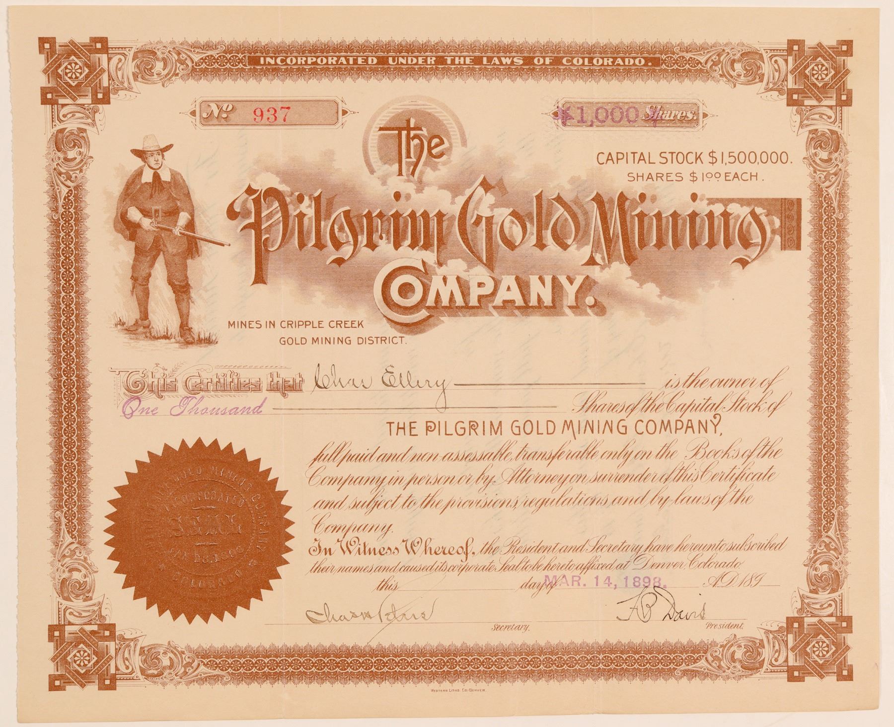 Stock Certificate from the Pilgrim GMC, incorporated in 1896, incorporated in Colorado, located in the Cripple Creek, certificate number 937, issued in 1898, issued to Chas Ellery, signed by F. B. Davis, and Charles M Peters, printed by Western Lith Co. - Denver, size 41162 by 8 inches, in Average condition, issued. Vignette: pilgrim, clouds masthead, Denver, Cr Crk, Brown seal, brown border."[Owns the Murray, 8 1/4 acres...the Andrew Extension 7 1/2 acres...on southeast slope of Grouse mountain, the Malisia 10 acres...and the south one half of the Old Abe 4 1/2 acres...on Copper mountain. All patented. About $3,500 worth of development work has been done to date. The company has no debts. The Malisia claim is leased. [The Official Manual of the Cripple Creek District, Colorado, U. S. A.]