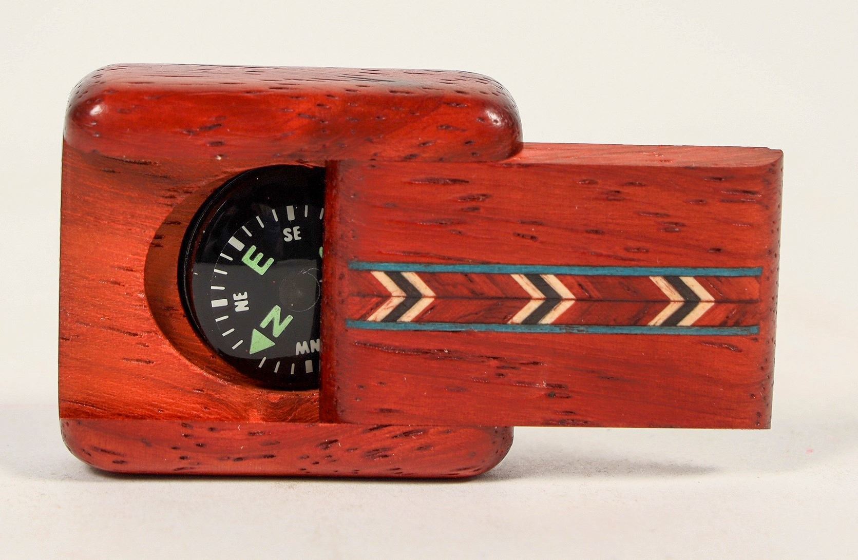 This little compass is housed in a mahogany case with a secret cover. The compass is made in Japan and reads fast. Follow the arrows for access. Please see photo for details.