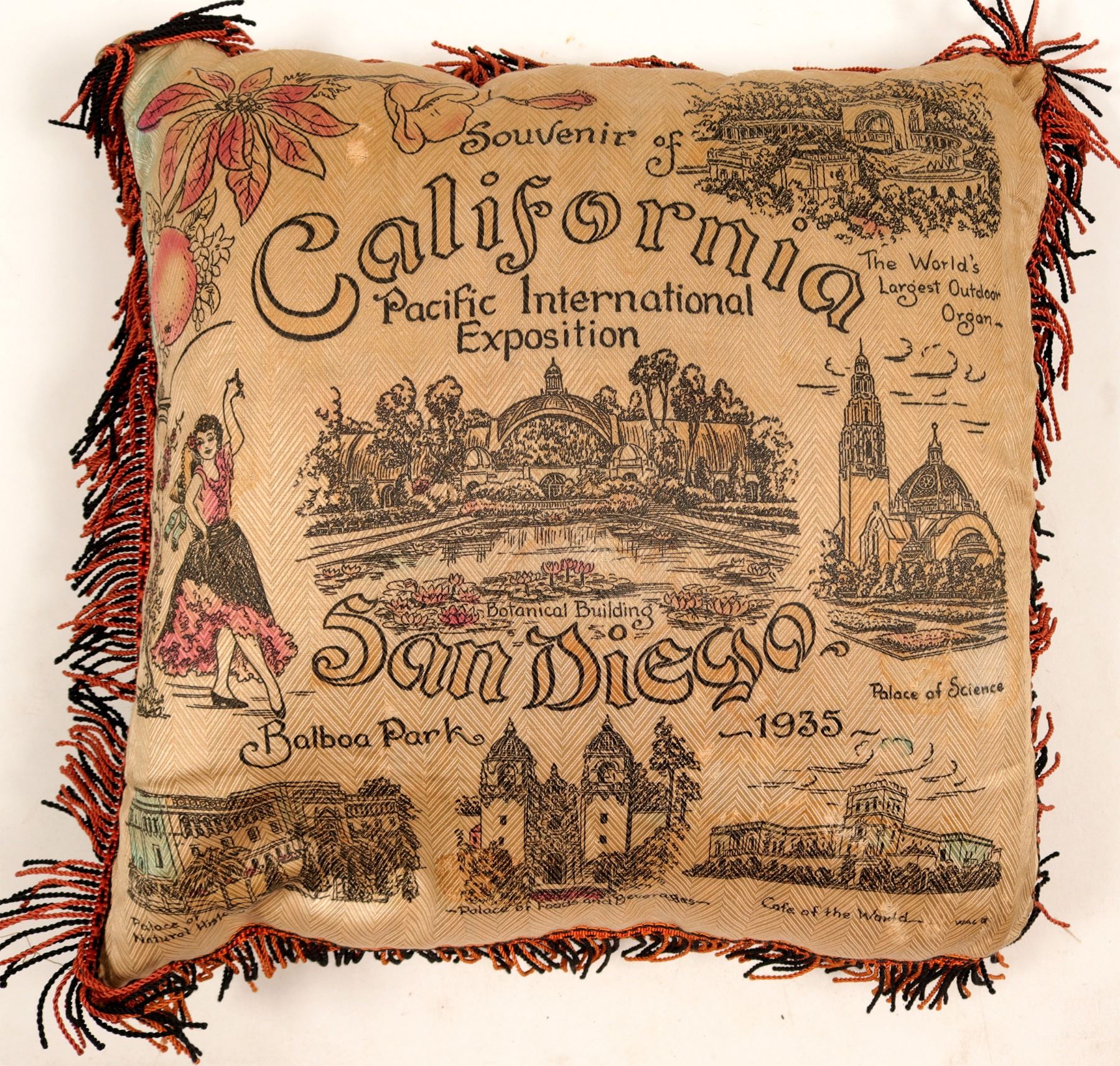 Here is a very beautiful and fine specimen. It is a souvenir of the California Pacific Exposition. It is a bronze color with black and orange fringe. It shows the Botanical Building, the Worlds Largest Outdoor Organ , the Palace of Science, a Spanish Dancer, The Palace of Natural History, Palace of Foods & Beverages and the Cafe Of The Word .The reverse is a pale green color, with a minor spot of stain. Overall, very good condition, and a one -of-a kind item. Very rare and unusual. If you collect exposition items...this is for you !! (RH).