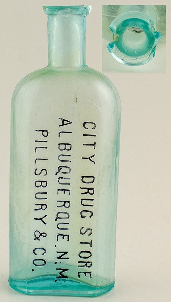 City Drug Store, Albuquerque, New Mexico, Pillsbury & Co. Aqua pan oval drug bottle 6.75 inches. Chips in top. Very rare. This may be the earliest embossed New Mexico drug bottle. Dates to the late 1880's. City: Albuquerque State: New Mexico Inventory Number: 38916