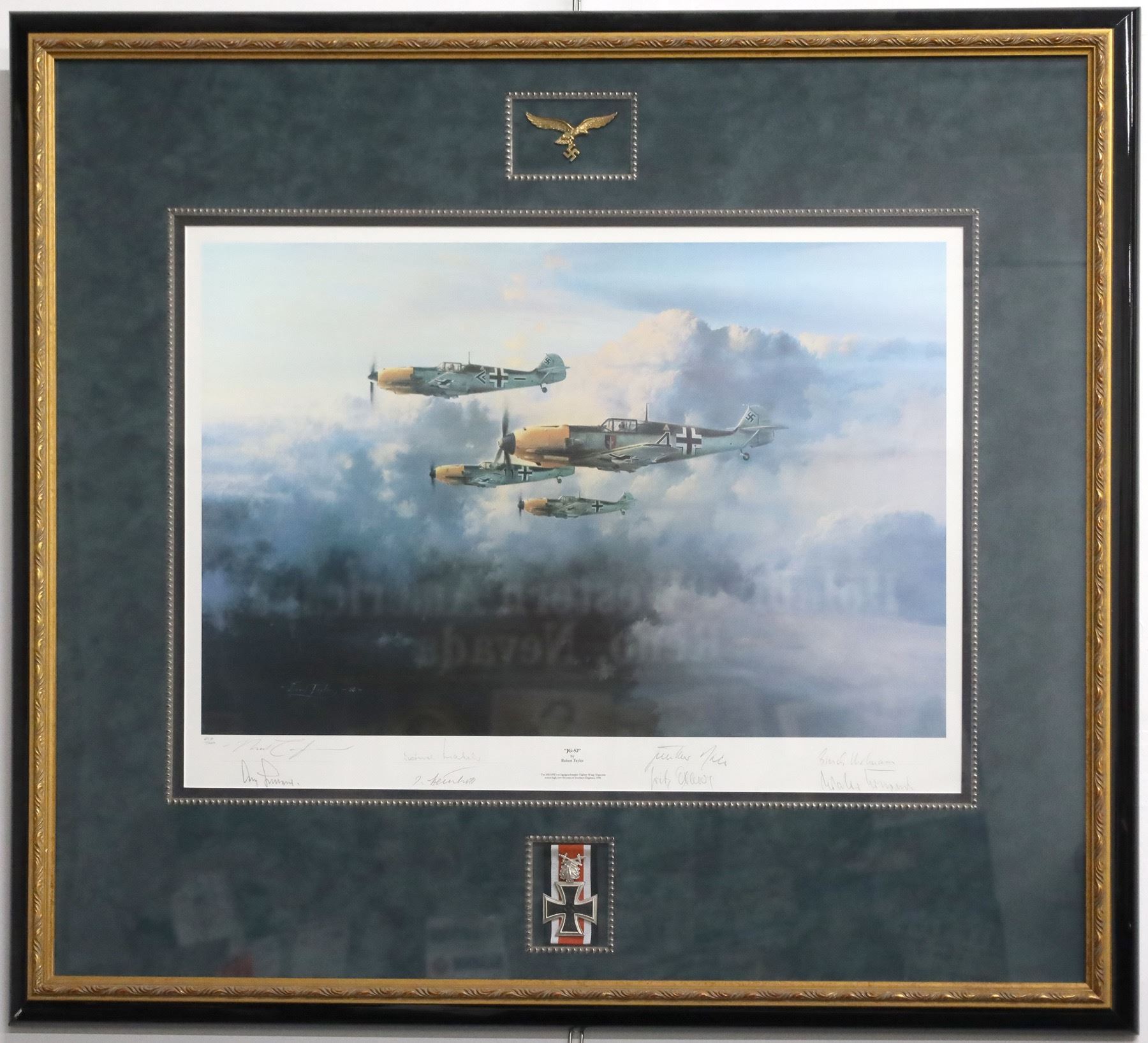 Lithograph description by artist, Robert Taylor, published on Aces-high.com website: "A Schwarm of Bf109s from JG-52 are about to peel away and, with the battle-cry ‘Horrido!’ ringing in their ears, dive to attack the flight of enemy aircraft spotted below. JG-52: the name alone brought terror into the hearts of the Red Air Force pilots. By the end of the war the Luftwaffe’s most successful Geschwader had claimed over 10,000 victories, and from within its ranks emerged the top three scoring Aces in the history of air combat; Gerhard Barkhorn, Gunther Rall and, of course, the highest scorer of them all – Erich Hartmann." Each print in this long sold out edition has been personally signed by the following legendary Luftwaffe Fighter Aces: