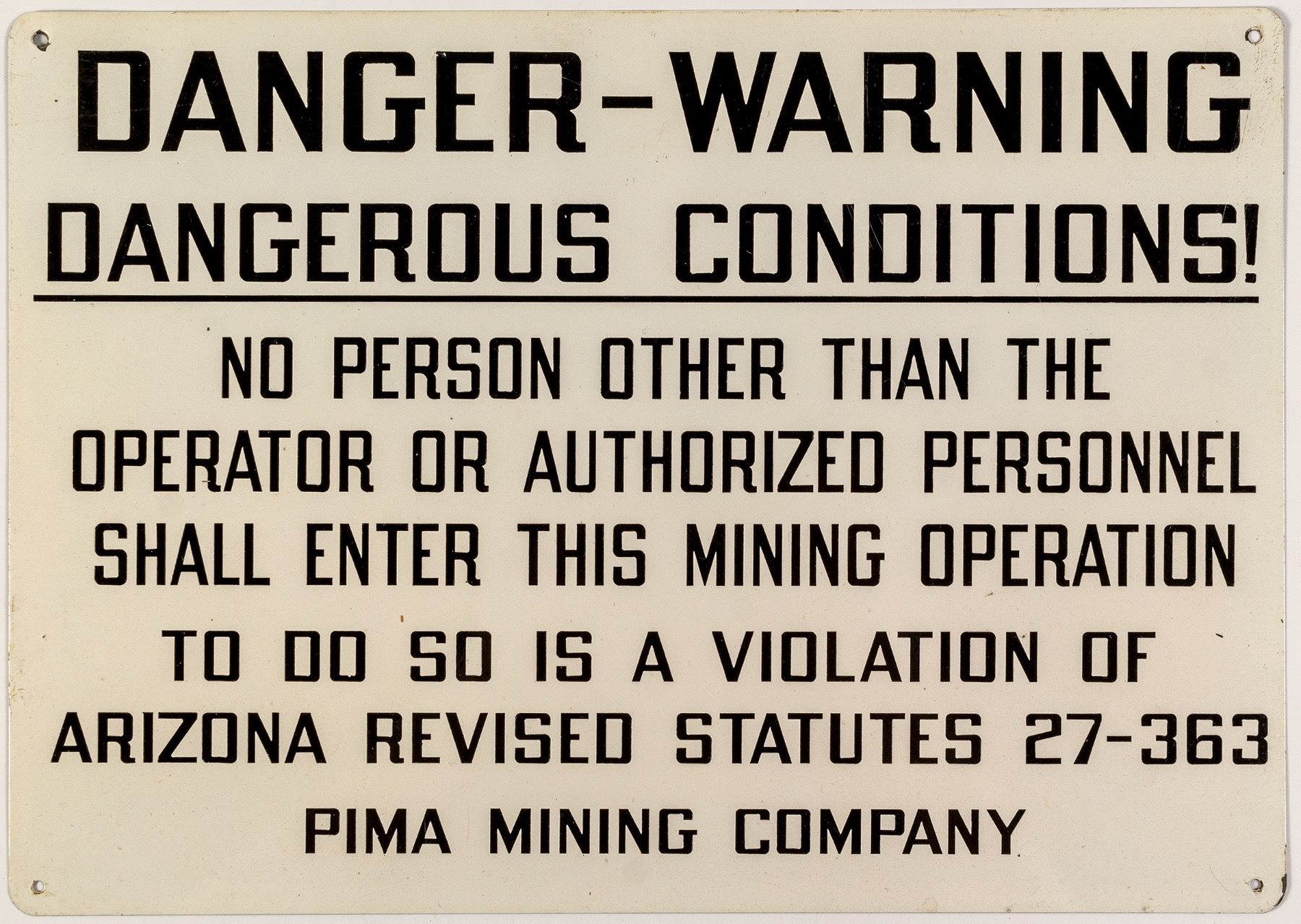 Black printing on white enamel. "DANGER-WARNING / dangerous conditions / no person other than the / operator or authorized personnel/ shall enter this mining operation / to do so is a violation of / Arizona revised statutes 27-363 / Pima Mining Company. 14 x 10 inches.
