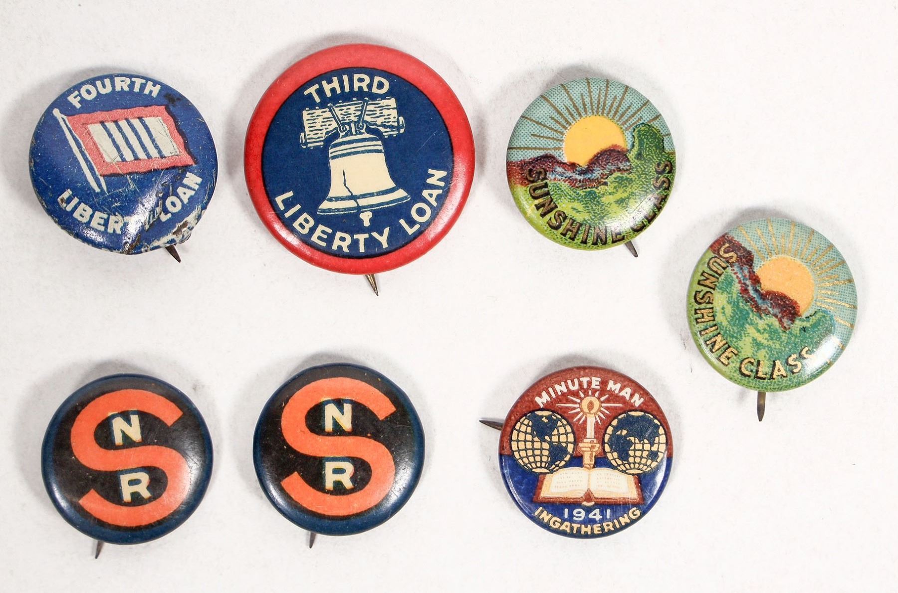 Seven small pinbacks (largest is 21 mm): Third Liberty Loan; Fourth Liberty Loan; 1941 Minute Man Ingathering; Sunshine Class (2); S N R (2).