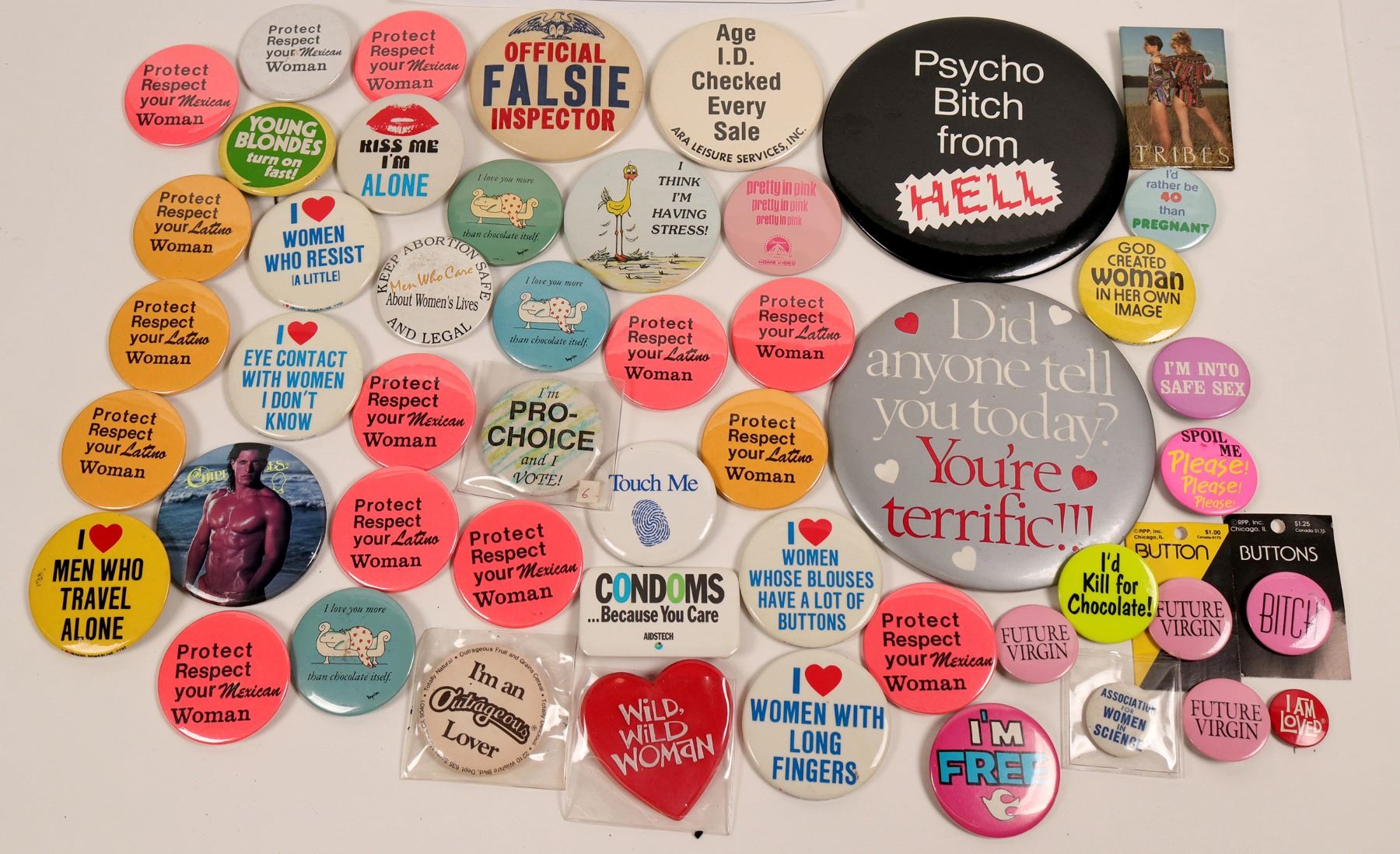 Lot of 50 pinback buttons, in an assortment of sizes, mostly related to women. Some are comedic, some crass, some romantic, and some about women's rights. Sizes range from 1-6 inch diameter. See photo for more details.