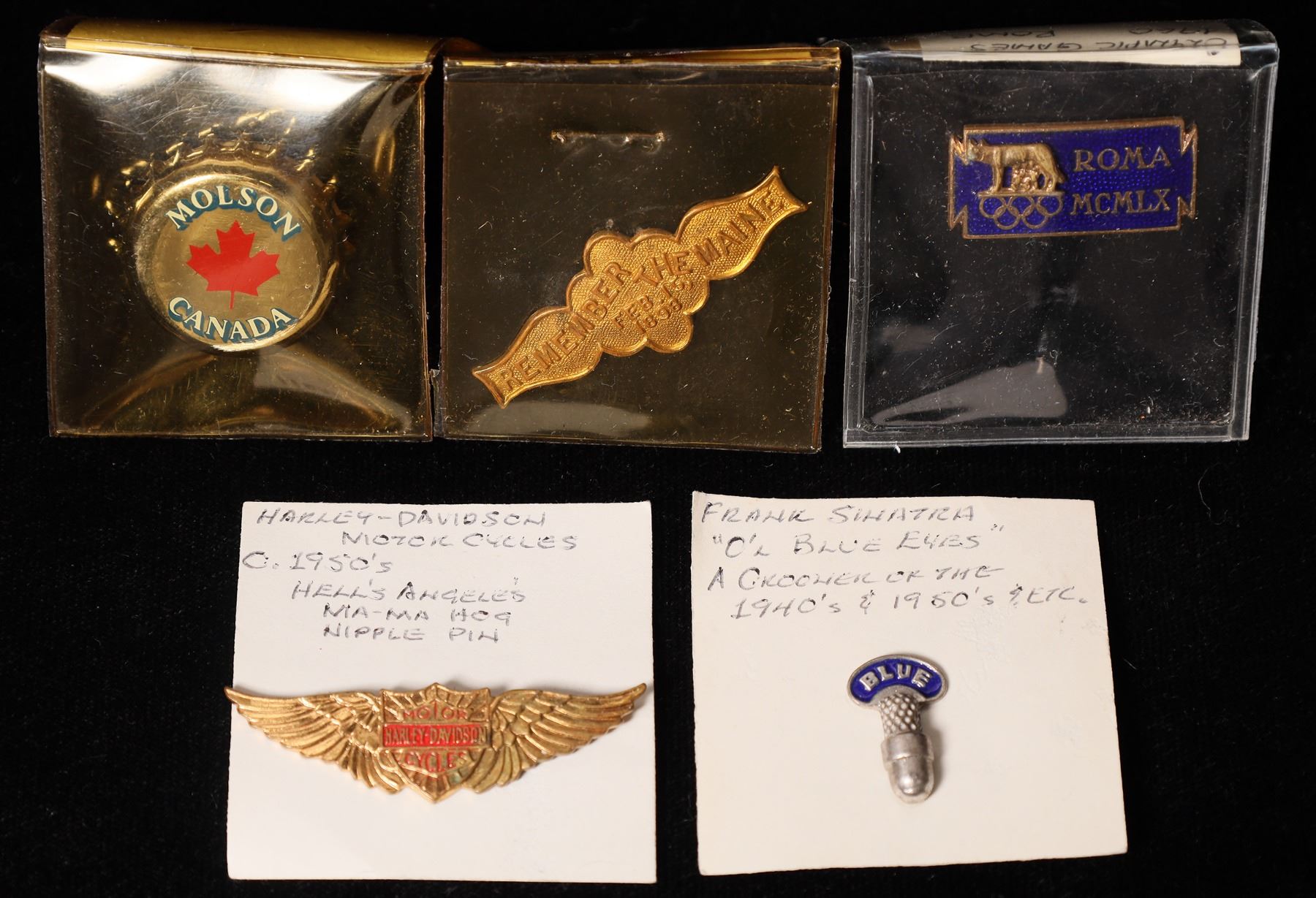 Lot of five pinbacks: Remember The Maine Feb. 15, 1898; Blue microphone dedicated to Ol' Blue Eyes Frank Sinatra; Molson, Manitoba (35 miles east of Winnipeg) beer bottle cap pinback; Harley Davidson Motor Cycles, circa 1950s; Rome Olympics 1960.