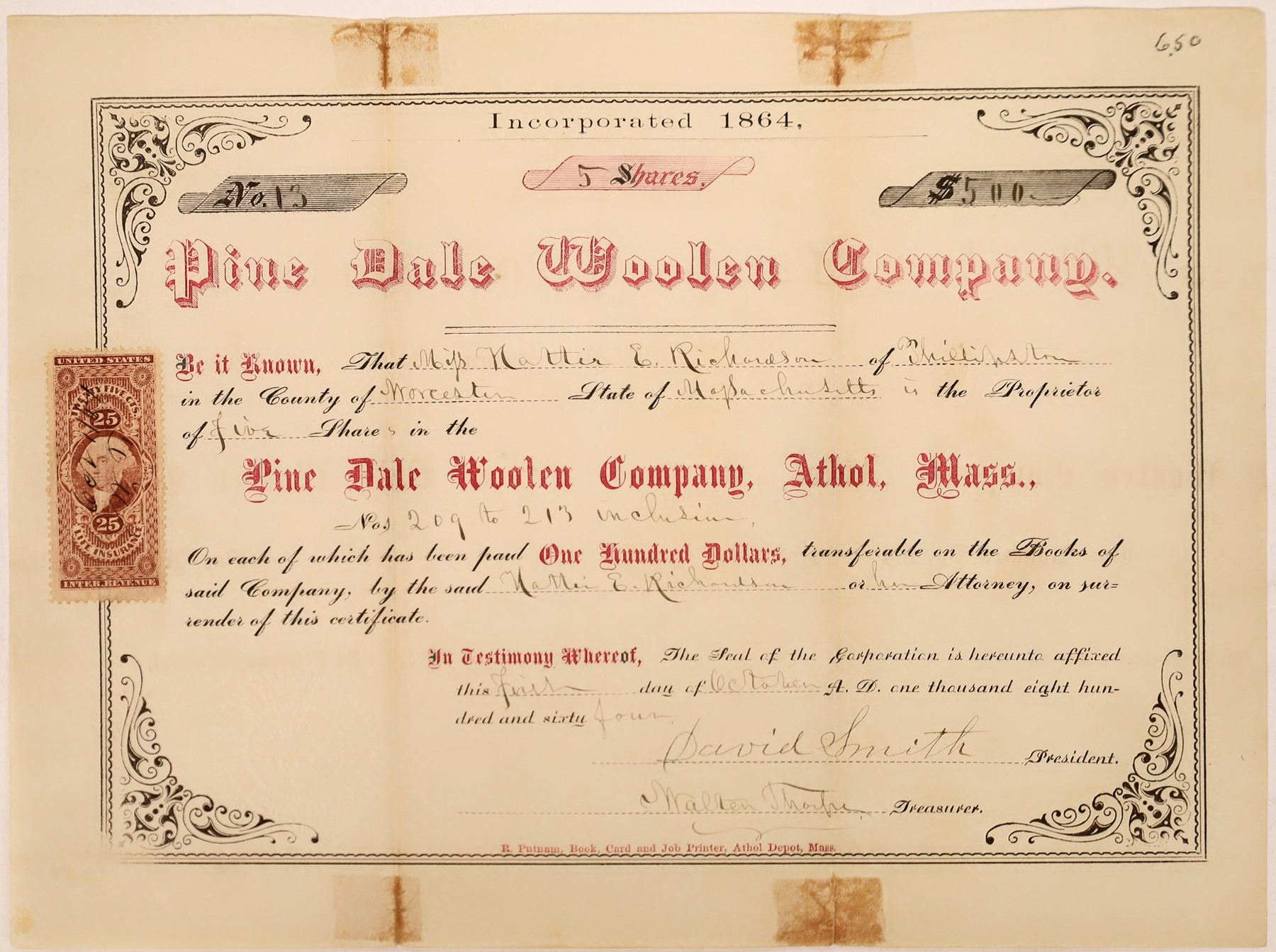 Incorporate. 1864 state of Mass. #13 for 5 shares @100par. Issued Oct 1, 1864 signed David Smith President, BLack, tan paper, no vignette, embossed seal, 25 cent revenue stamp on front left. VG, tape on over folds on back. During the Civil war many small mills opened to support the making of uniforms for the Union Army. And close just as quickly with the Confederate embargo placed on cotton diluted the mills output and had to shut down.