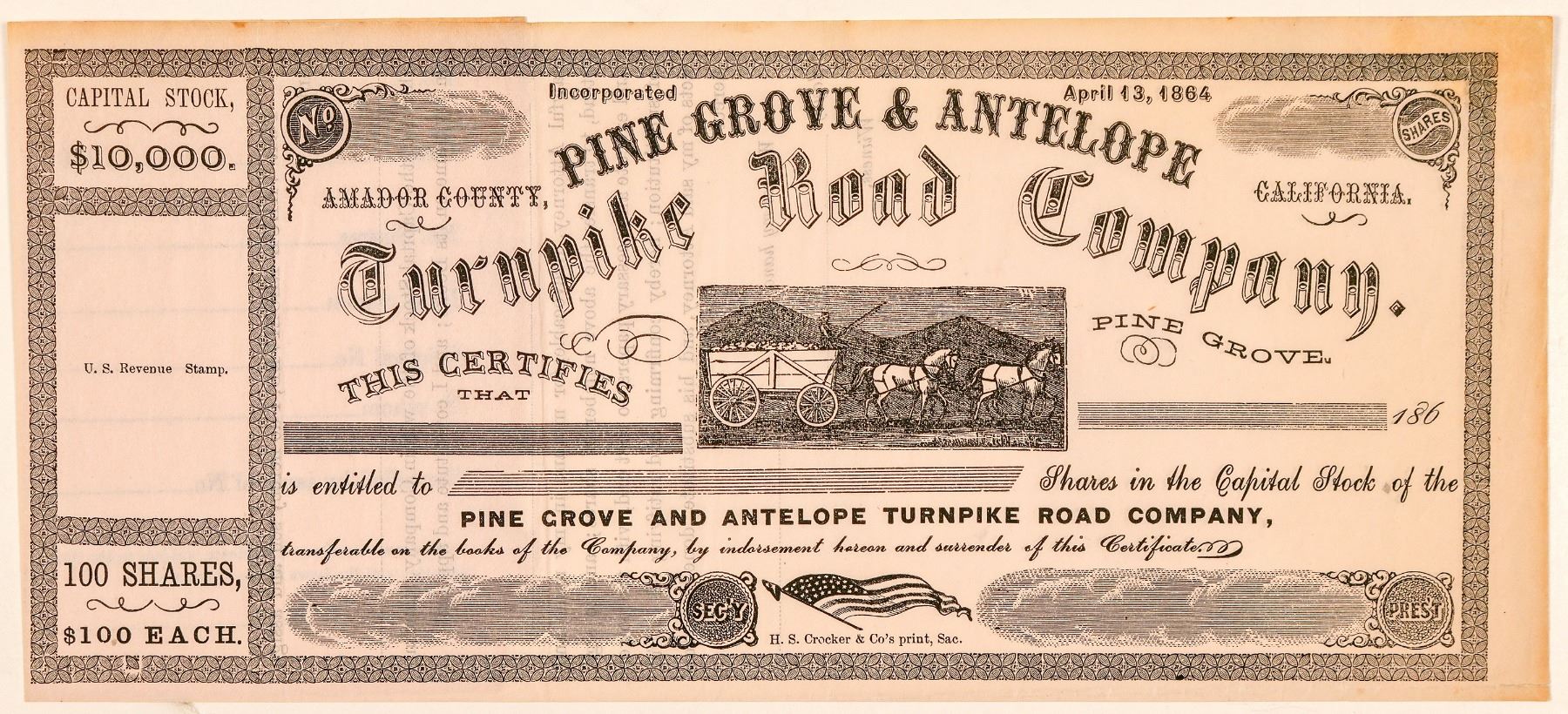 Unissued, but rare! Amador County, California (printed above title). Dateline Pine Grove, 186-. Inc. April 13, 1864. Black border and print. Vignette of horse-drawn wagon and smaller vignette of American flag. Fancy company logo. Printed by H.S. Crocker & Co., Sacramento. 4 x 9.25" Stub still attached. Some toning. Passed by legislation, April 18th, 1863. John Vogan and Charles Green are granted permission and rights to build a road from Pine Grove to Antelope Springs via. Aqueduct City in Amador County. Ken Prag Collection
