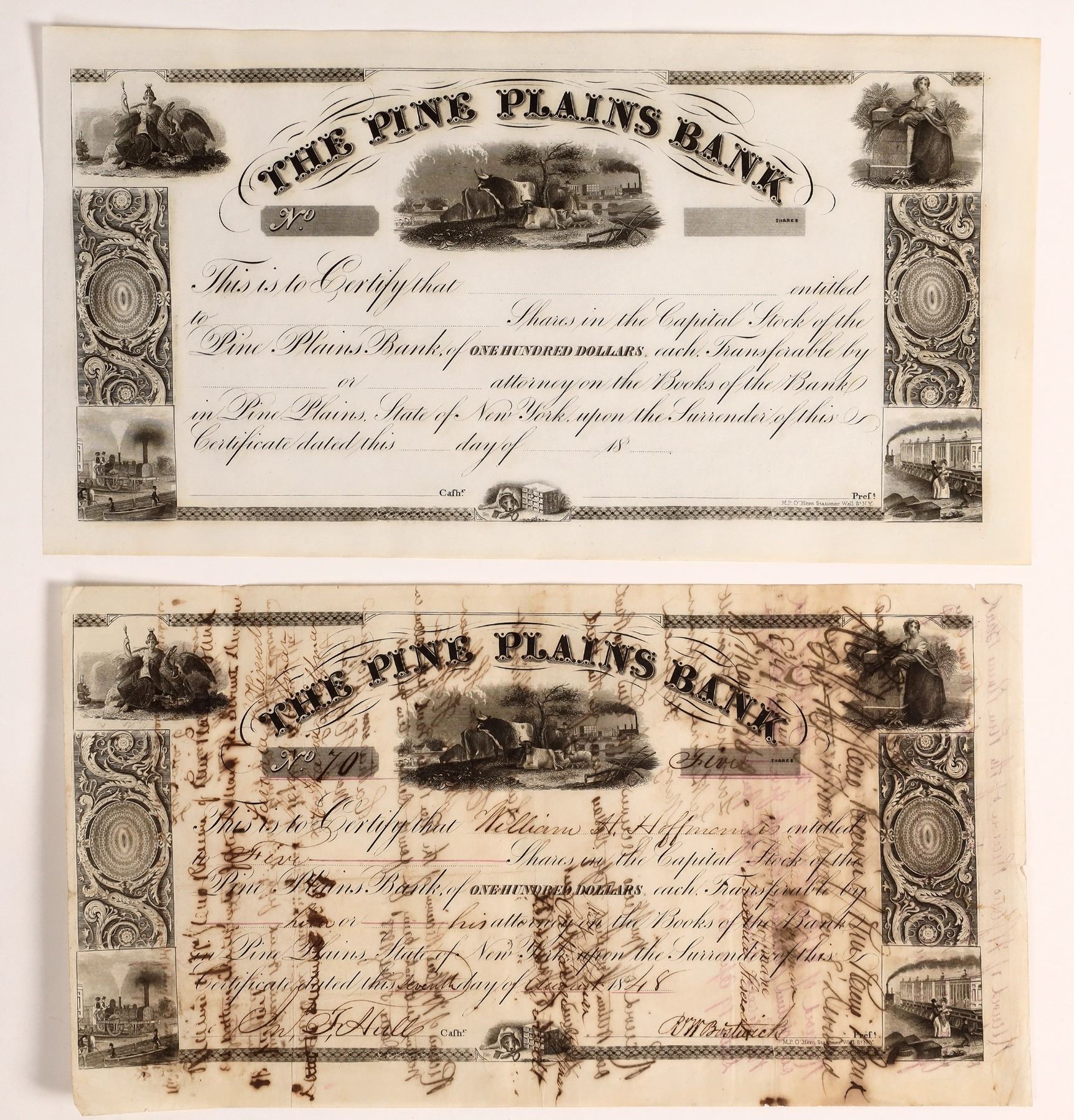 Lot 2: one issued and one unissued. Issued piece is no. 70, issued for 5 shares to William H. Hoffman in 1848. Signed by president Bostwick and cashier Hills. Pen cancelled. Numerous pen notations on reverse. Printed on very thin paper with multiple allegorical vignettes. 6 x 10.5" Folds, creases. Plus unissued example. The Pine Plains Bank was organized in 1839, The first meeting for the organization was held at the hotel of Henry C. Myers (now Stissing House), at which seventeen directors were named. The bank had a capital of one hundred thousand dollars, divided into one thousand shares of one hundred dollars each. The bank closed its doors in 1857. The town of Pine Plains is one of the northern tier of towns in Dutchess, bordering the county of Columbia. Extensive plains originally covered by pine forests gave the town its name. Pine Plains New York