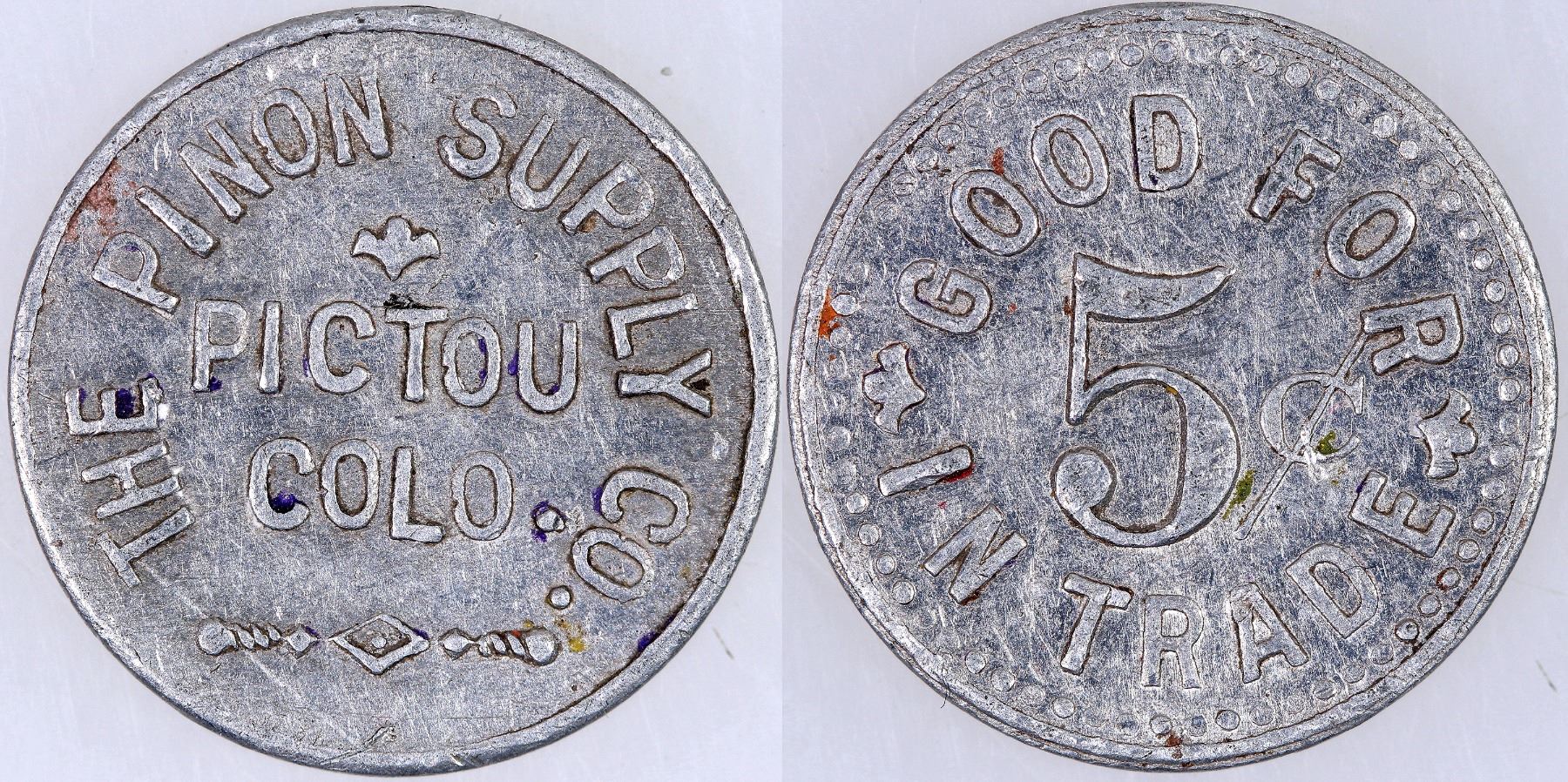 THE PINON SUPPLY CO. / PICTOU / COLO. // GOOD FOR / 5¢ / IN TRADE; Al., rd., 18 mm.