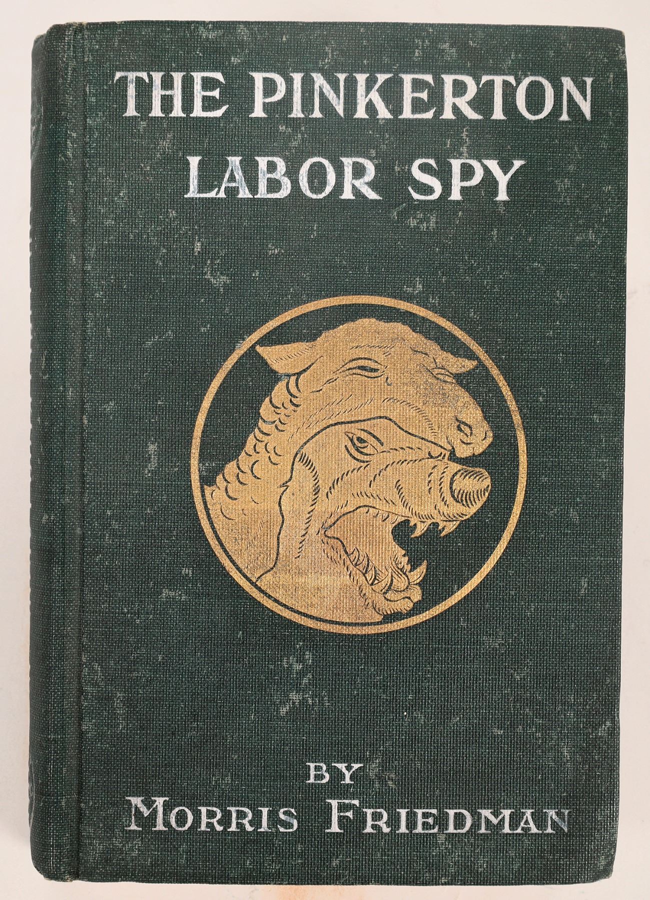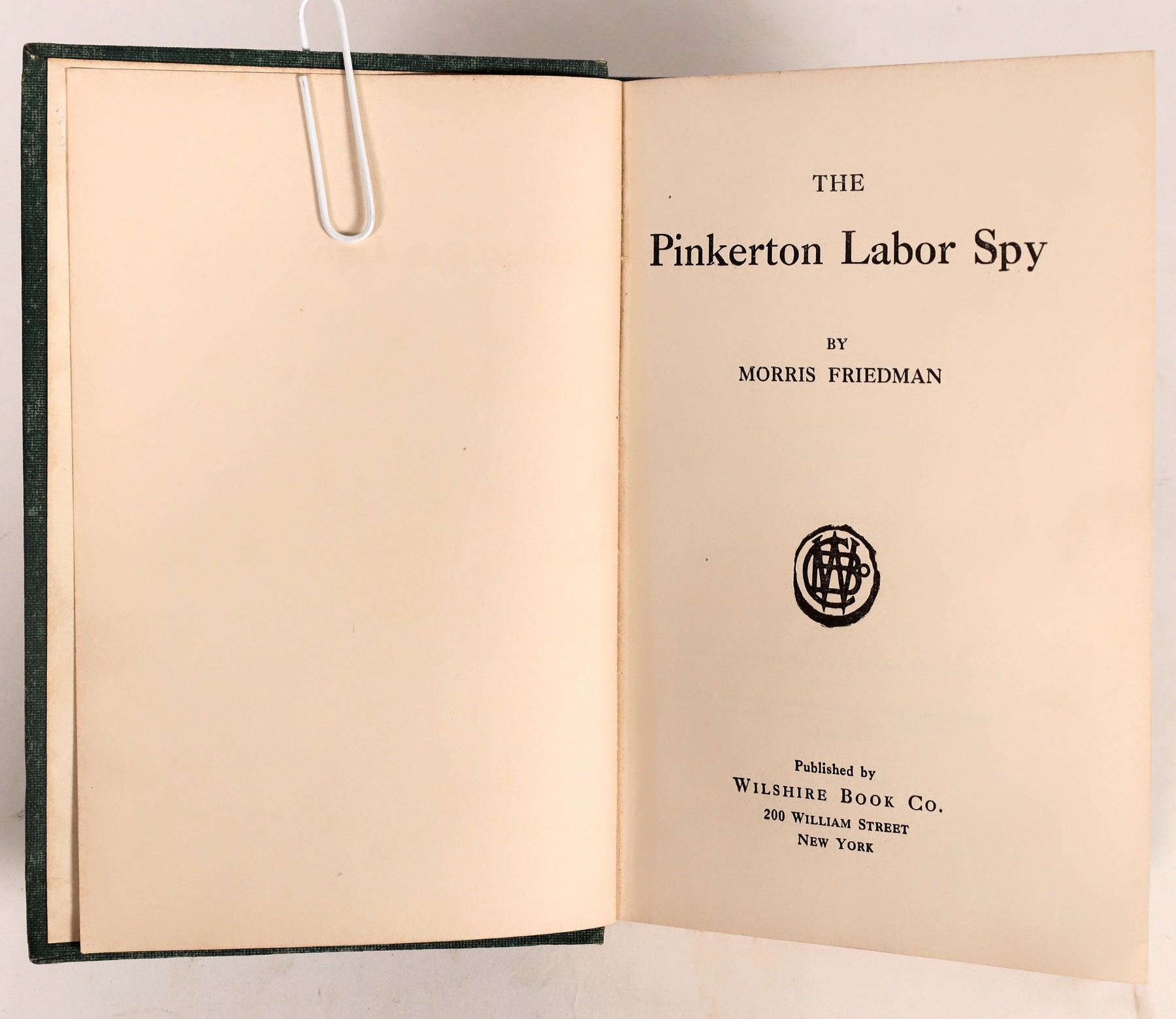 Rare 1907 The Pinkerton Labor Spy by Friedman. Attractive binding. 229pp. "The Pinkerton Labor Spy (alternately, The Pinkerton's Labor Spy) is a nonfiction book published in 1907 as an exposÈ of intrigue and abuses by the Pinkerton Detective Agency in general, and by chief agent James McParland in particular. The book detailed the use of spies by mining and ore milling companies during the period of the Colorado Labor Wars. It described the recruiting, utilization, and management of agents who infiltrated the Western Federation of Miners and the United Mine Workers unions for the purposes of disruption, sabotage, and gathering information. The author of the book, Morris Friedman, had worked in the agency as Mr. McParland's stenographer." from wikipedia. Board corners are curved inward.