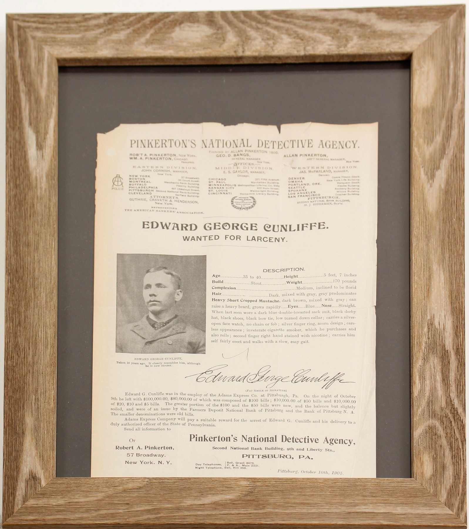 Edward George Cunliffe is WANTED for Larceny! And this wanted poster would have been circulated across the country in search of this man. Issued by none other than Allan Pinkerton himself, the founder of Pinkerton's National Detective Agency, it contains a detailed description and a photograph of the fugitive along with a description of his alleged crimes against the Adams Express Company, which offers a "suitable reward" for his arrest. The poster itself is approximately 8.5 x 12 inches and has come loose from the black matte board behind it. The glassed frame is approximately 13.75 x 16.75 inches with an opening of 10.5 x 13.5 inches. The poster is in good condition with only minor creases and damage to the very edges and top left corner. State: Pennsylvania City: Pittsburgh Date: 1905