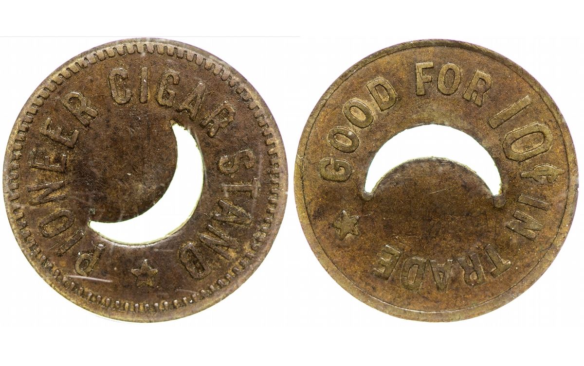 Pioneer Cigar Stand // GF 10c IT. Crescent moon cut in center. NCS