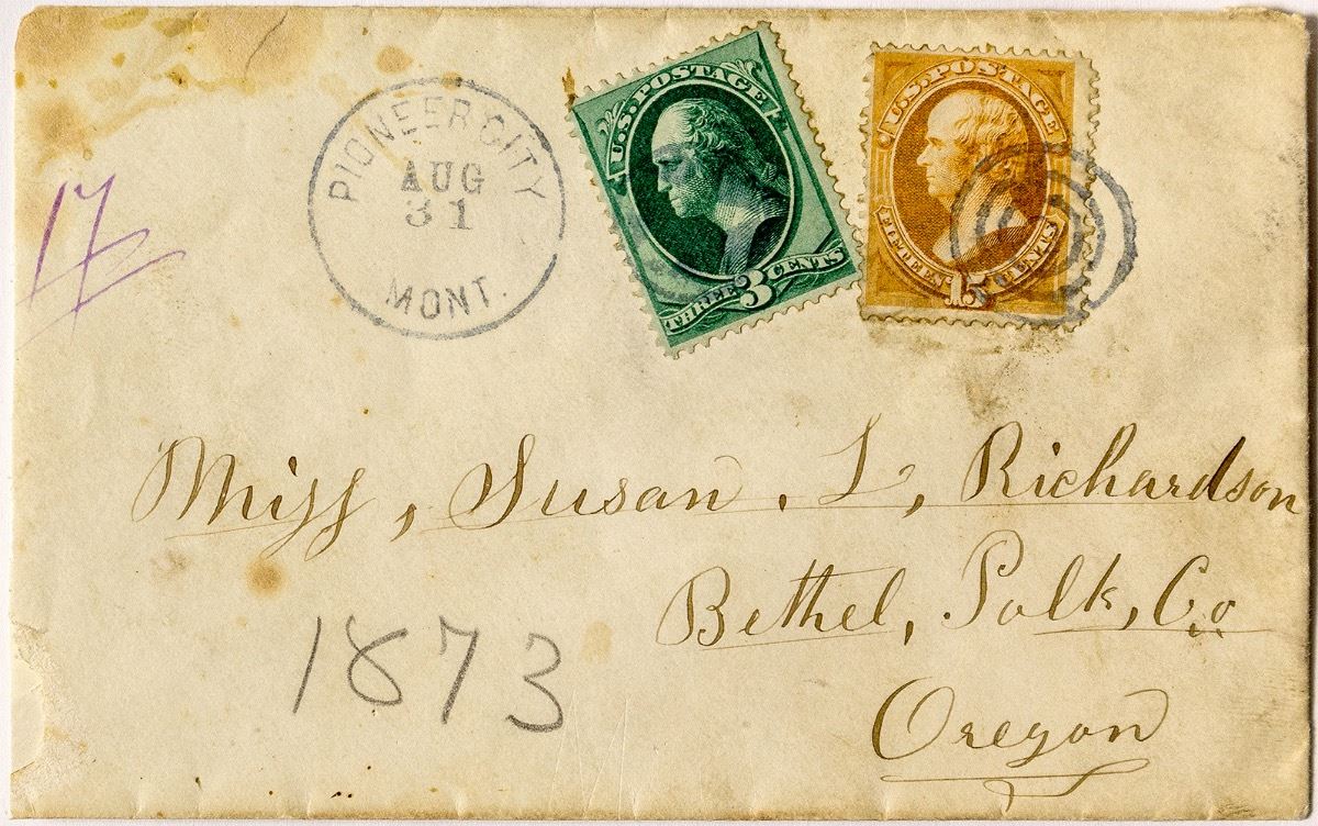 Post office opened in 1870. No date in cancel, but 1873 is handwritten. Target killer. 18c postage with a 15c orange and 3c green stamp. Three examples of Pioneer City reported in Shellen & Dunn. (Svoboda Collection) City: Pioneer City State: Montana Date: c1873 HWAC# 35254