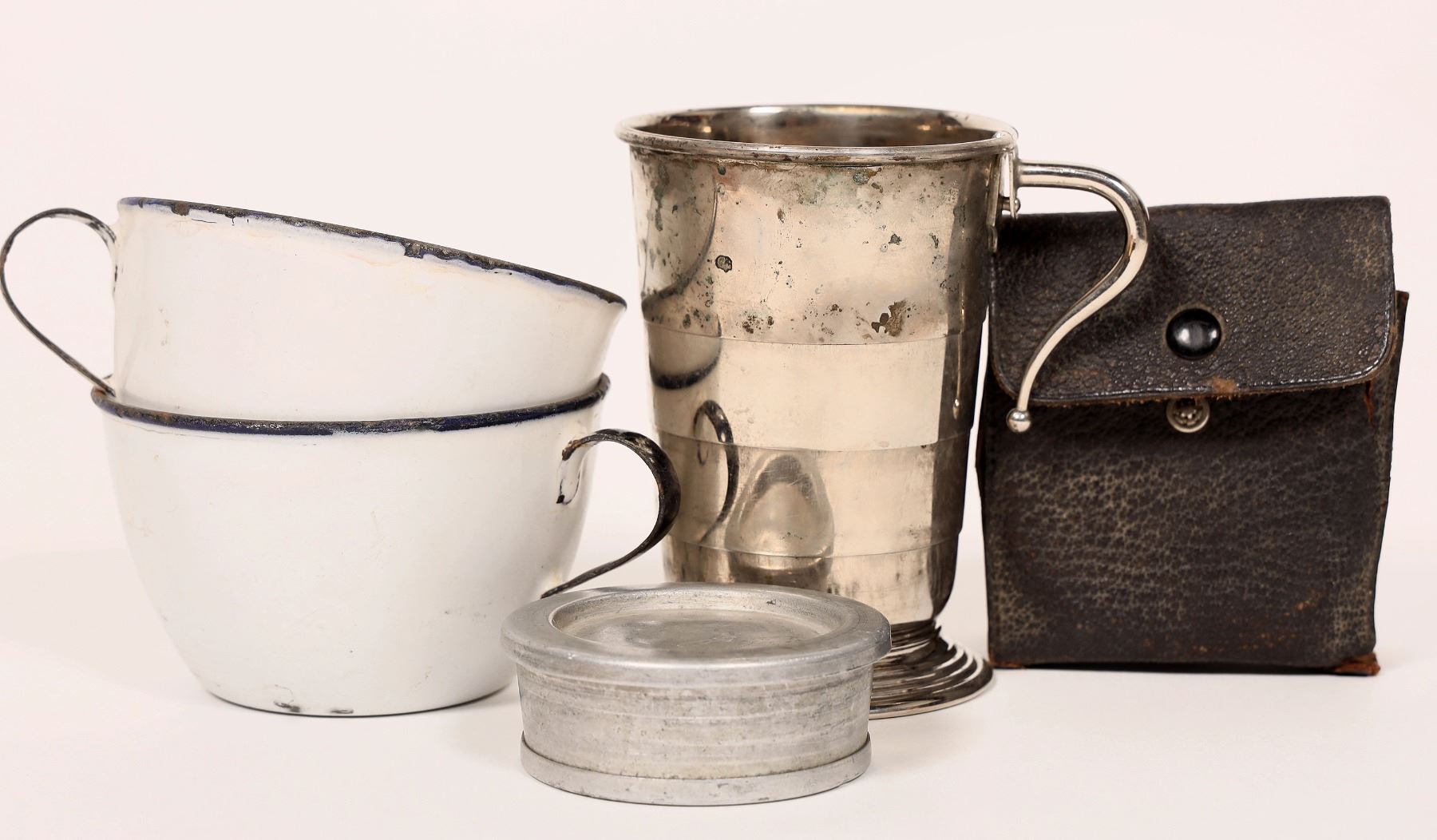 Cups for around the campfire: two metal white cups with black trim; two collapsible metal cups (one with leather case). Vintage. [