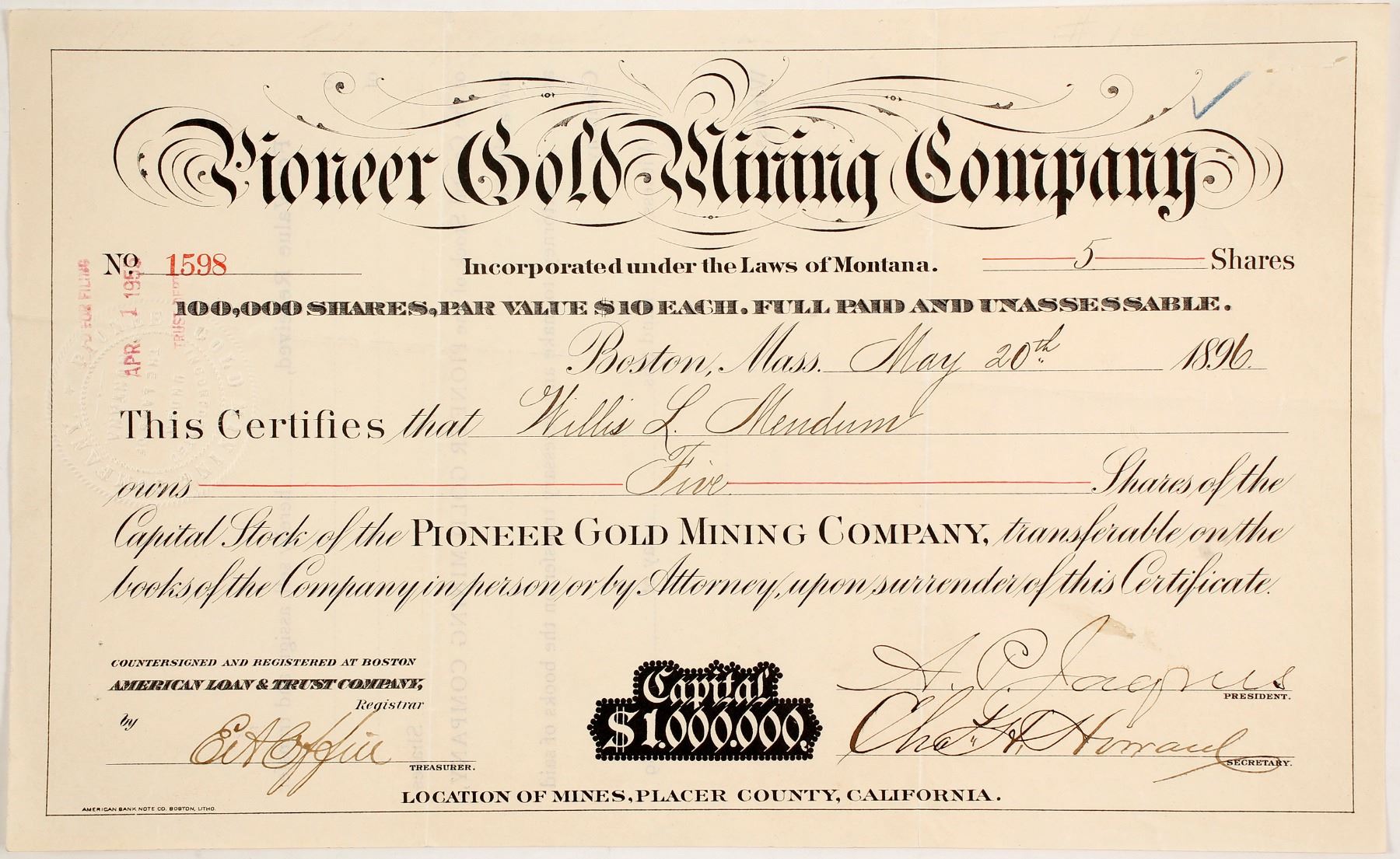 # 1598 for 5 shares to WIllis L Mendum. Signed by EA Effie(?), Charles Howard and president AP Jacques. Dateline Boston 1896. Not cancelled. Printer American Bank Note. Folds, blue check mark, pin holes, etc. Good. Not listed in Filer. According to California Mines & Minerals (1899), the mine was located 8 miles south of Towle and had the deepest quartz mining operations in the county. JJ Sullivan is supt. Ledge located on the north fork of the American River. Tunnel No. 4 cuts the vein at the 1,000 ft. level. They have a 20 stamp mill driven by water horsepower. Ken Prag Collection