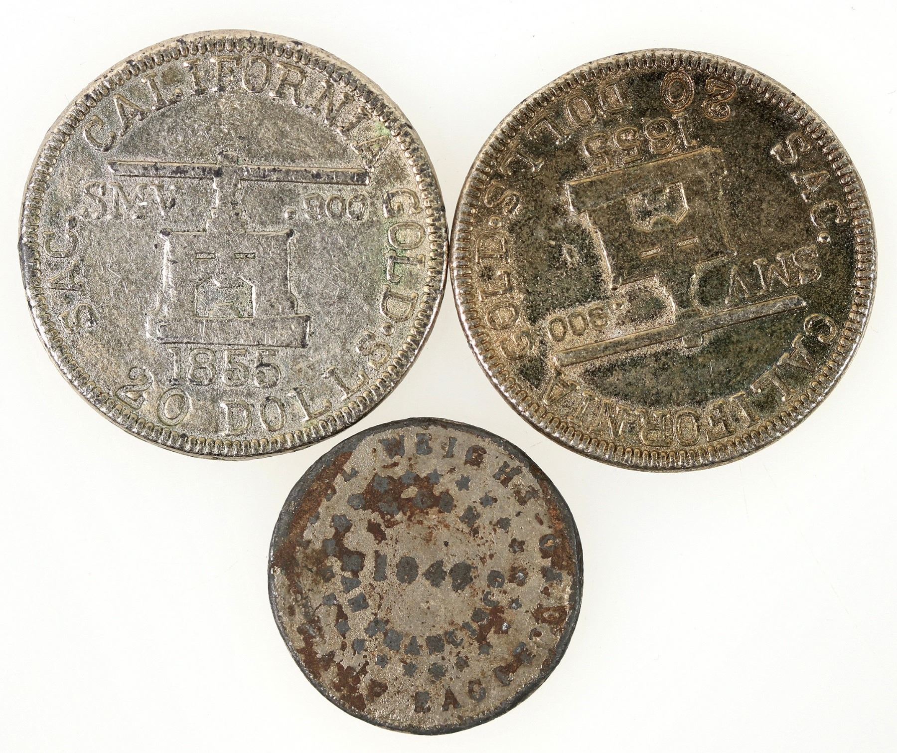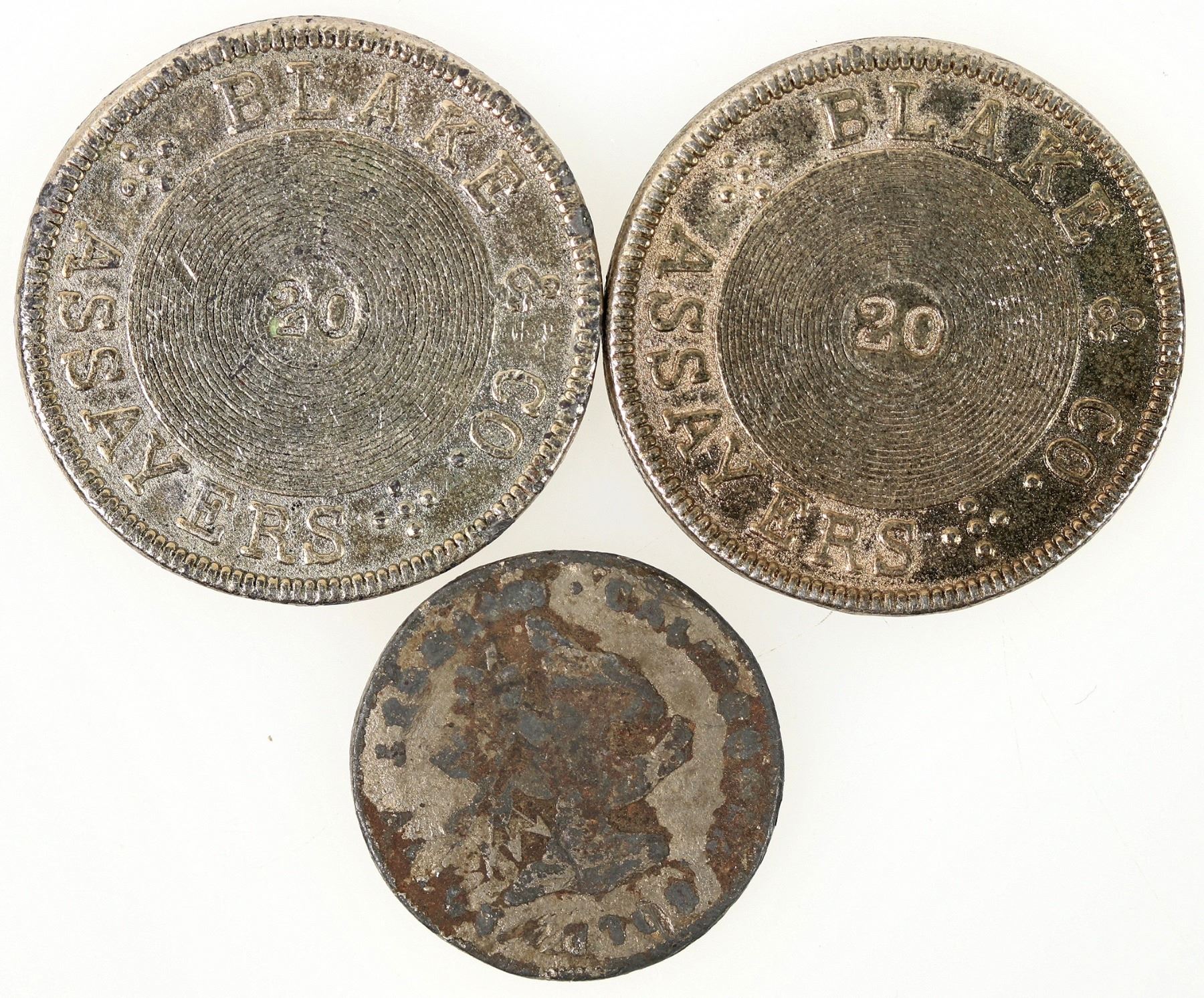 Two Blake and Company Assayers 1855 $20 restrikes; 1849 half eagle, crude, rough shape.
