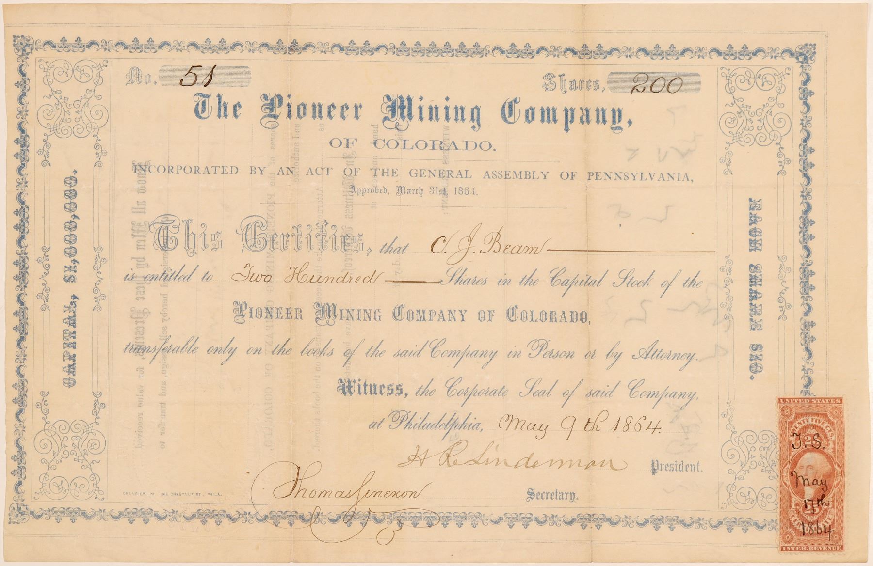 Stock Certificate from the Pioneer Mining Co. of Colorado. Incorporated in May 9, 1864 in Pennsylvania. Located at Empire. Certificate number 51 issued in 1864 at Philadelphia to CJ Beam. Signed by H R Lindeman president and Thomas Linenon. Printed by Chandler, Philadelphia. Size 10.5 by 7 inches. Not cancelled. Nice condition. 25c Certificate revenue stamp. The mine was near Empire. For years, it was run by David Ball with a 16 stamp mill. Not listed in Hollister. Holabird sold a slightly different and later form of this certificate from the Filer Collection. At that time, that certificate was the earliest certificate we had seen from this part of Colorado. This cert. is earlier. [Ref: Fossett]