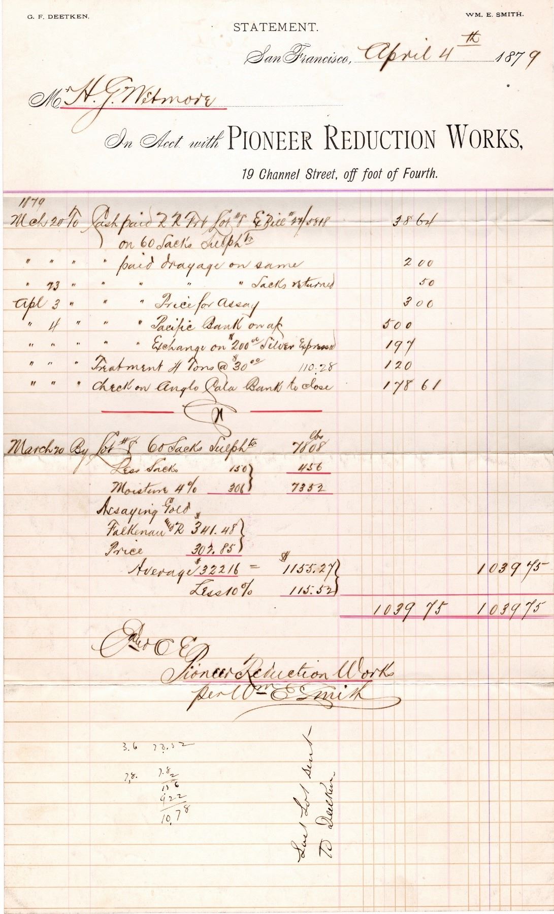 Pioneer Reduction Works Statement Ò G.F. Deetken and Wm. E. Smith San Francisco April 4, 1879 Ò To H. G. Westmore for Assay and Refining charges. Some of the charges listed are subbed out to Thomas Price and Falkenau. Deetken was a pioneer in developing refining techniques. Size: 8.5 x 14 inches. San Francisco California 1879