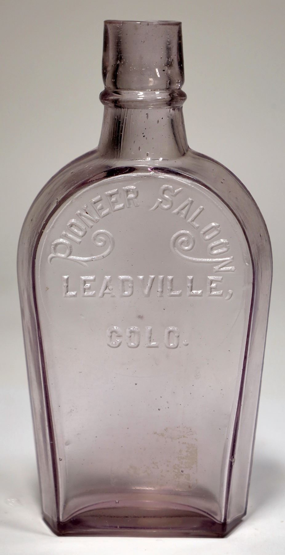Identical to Preble W-117, but perhaps an unlisted size (this one is smaller). Pioneer Saloon / Leadville, / Colo. Purple glass, pocket coffin flask, 5 7/8", wiped top. Scrollwork lettering. Bubbles, haziness, chip on lip. Very rare. Please inspect. The Pioneer Saloon was located on Chestnut Street. In 1879, it was the site of a murder between John W. Elkins, a black man, and Charles Hines, a white man. Elkins stabbed and mortally wounded Hines.