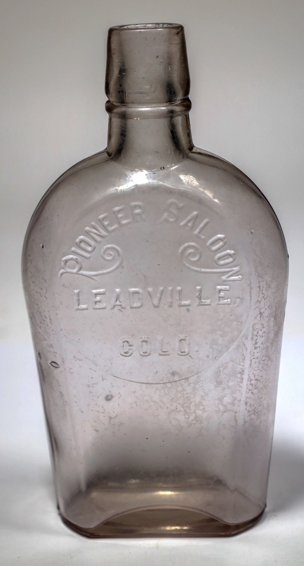 Preble W-117. Pioneer Saloon / Leadville, / Colo. Very faint purple, pocket coffin flask, 6.125", wiped top. Scrollwork lettering. Bubbles, haziness, bruise front bottom. Very rare. Please inspect. The Pioneer Saloon was located on Chestnut Street. In 1879, it was the site of a murder between John W. Elkins, a black man, and Charles Hines, a white man. Elkins stabbed and mortally wounded Hines.