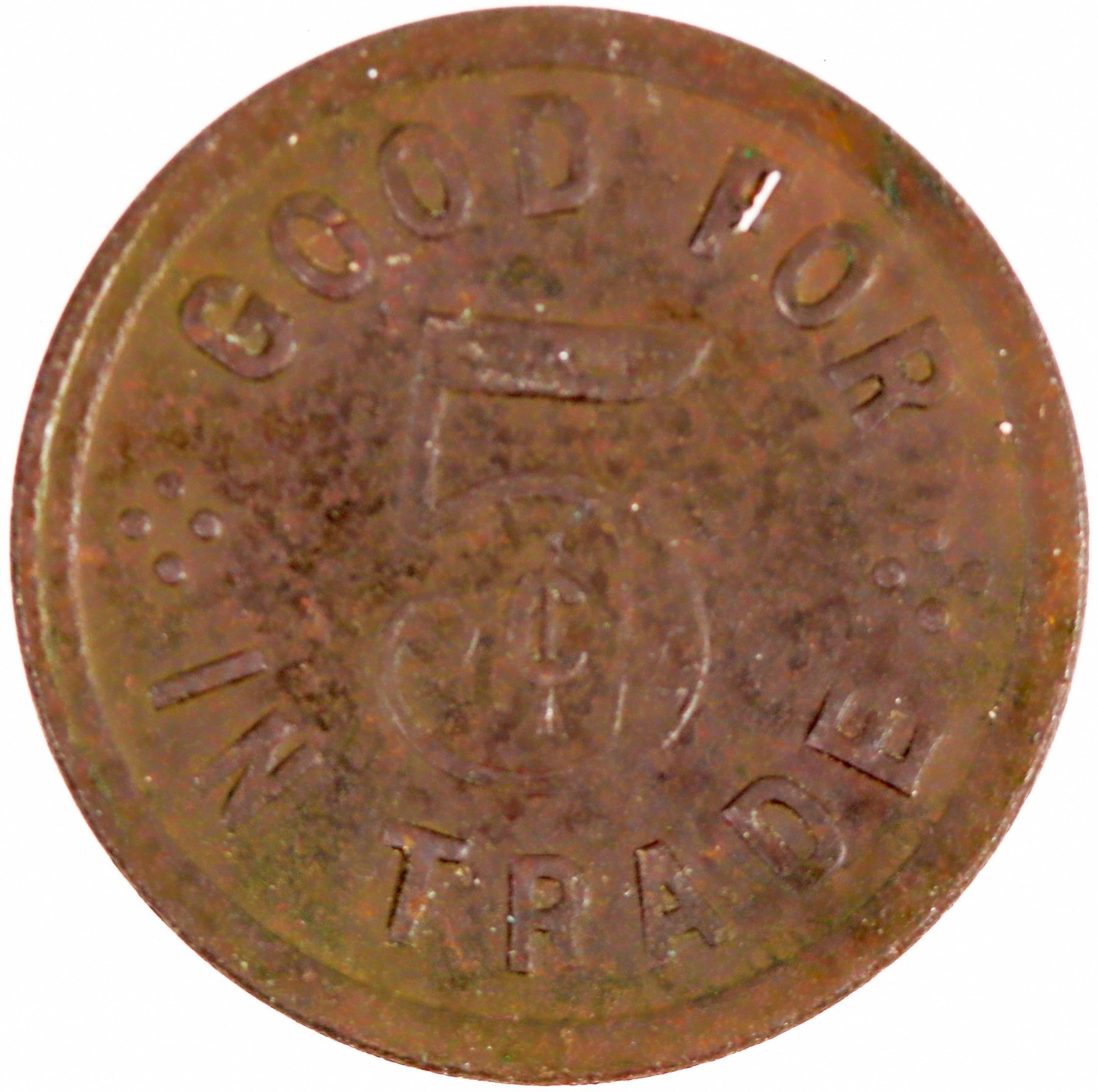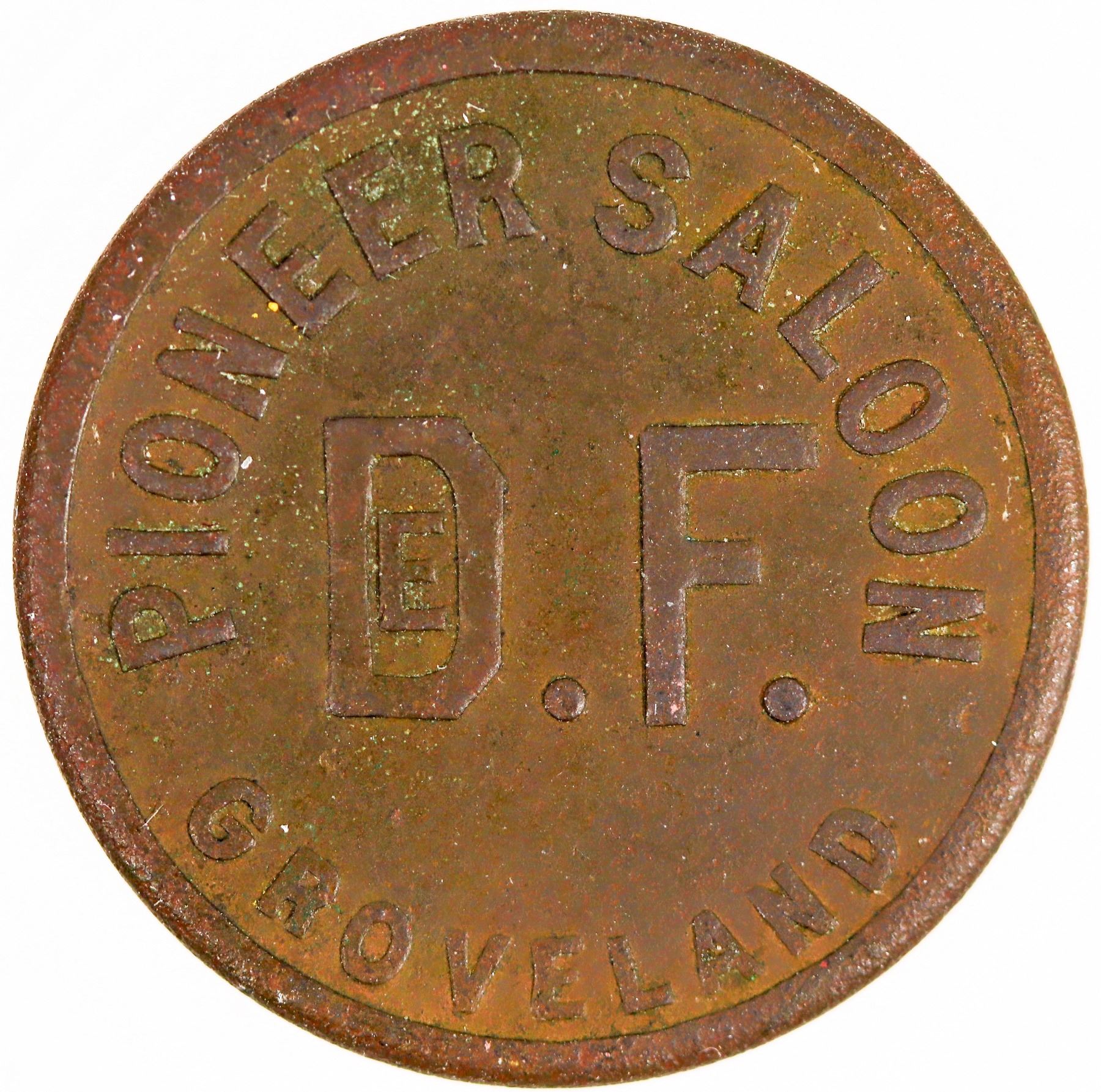 Henry and Giacomo Deferrari are listed in business directories from 1905 and the census for Tuolumne Township as saloon keepers. A newspaper report lists H. M. DeFerrari as owner. A rare token from Groveland: PIONEER SALOON / D.F. (small E within D) / GROVELAND // GOOD FOR / 5c / IN TRADE; Br., rd., 21 mm.