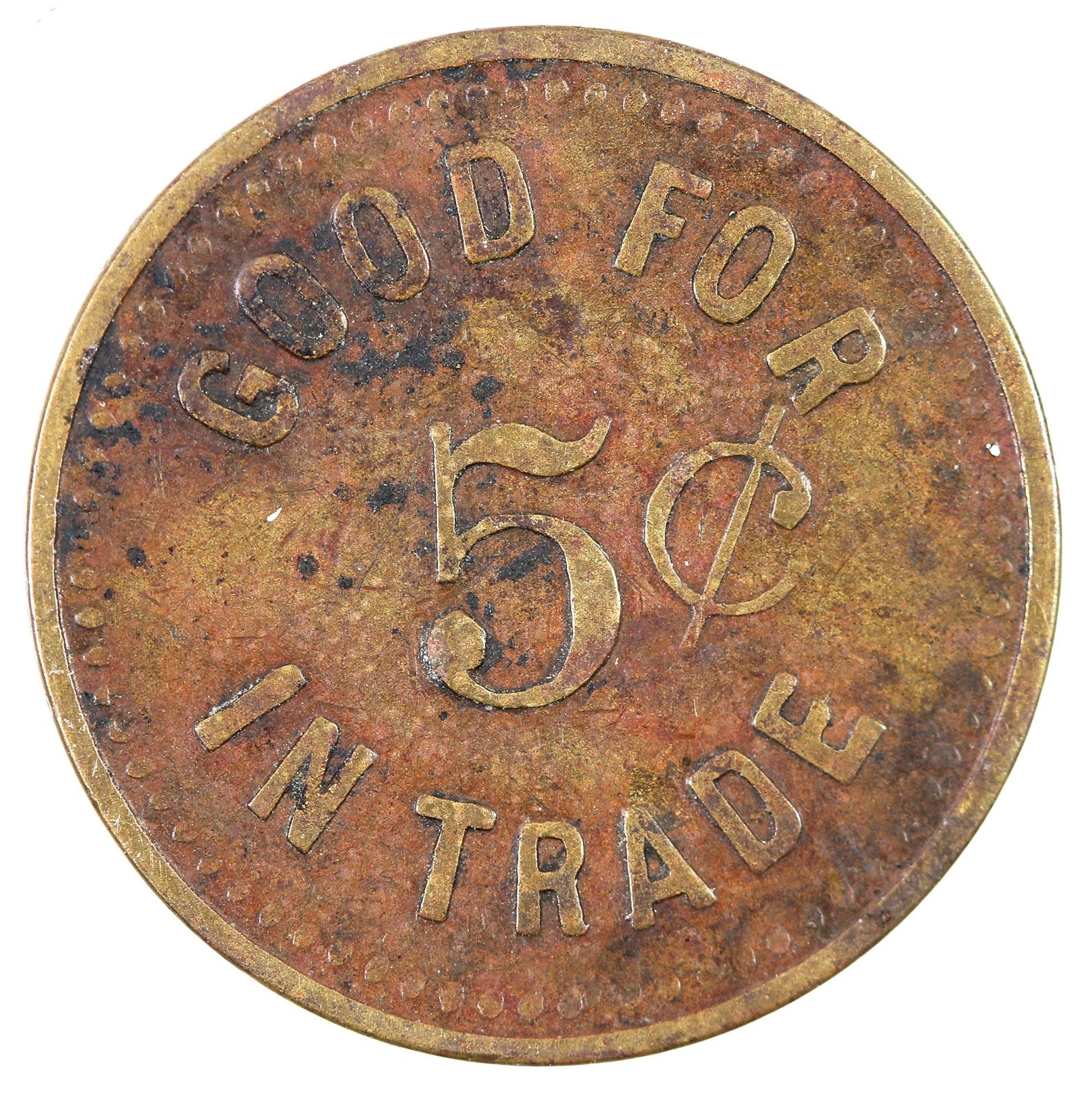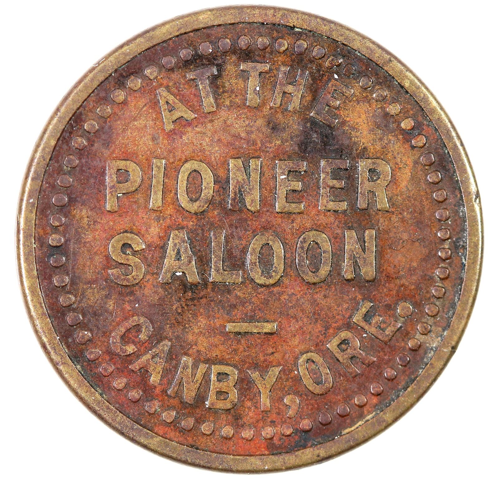 Clackamas County: AT THE / PIONEER / SALOON / CANBY, ORE. // GOOD FOR / 5¢ / IN TRADE; Br., rd., 21 mm. [ Canby Oregon. Also a brand new copy of "Oregon Trade Tokens," by James Hemphill.
