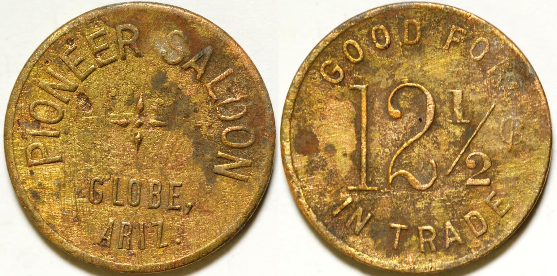 Obv.: Pioneer Saloon / Globe, / Ariz.; Rev.: Good For / 12 1/2c / In Trade. Br. rd., 20 mm. Daniel Manassillian Collection. State: Arizona City: Globe Date: HWAC# 84375